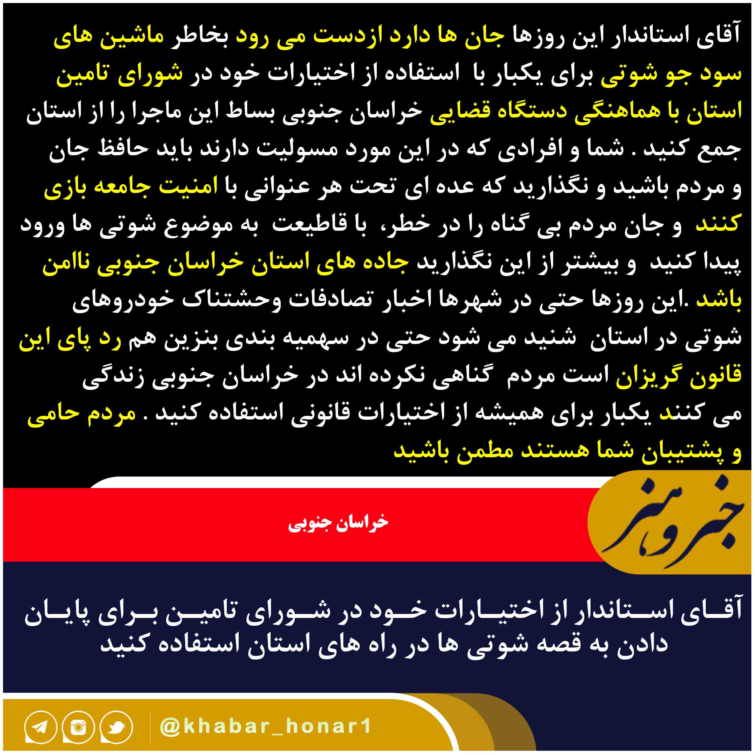 آقای استاندار این روزها جان ها دارد ازدست می رود بخاطر ماشین های سود جو شوتی برای یکبار با استفاده از اختیارات خود در شورای تامین استان با هماهنگی دستگاه قضایی خراسان جنوبی بساط این ماجرا را از استان جمع کنید . شما و افرادی که در این مورد مسولیت دارند باید حافظ جان و مردم باشید و نگذارید که عده ای تحت هر عنوانی با امنیت جامعه بازی کنند و جان مردم بی گناه را در خطر، با قاطیعت به موضوع شوتی ها ورود پیدا کنید و بیشتر از این نگذارید جاده های استان خراسان جنوبی ناامن باشد .این روزها حتی در شهرها اخبار تصادفات وحشتناک خودروهای شوتی در استان شنید می شود حتی در سهمیه بندی بنزین هم رد پای این قانون گریزان است مردم گناهی نکرده اند در خراسان جنوبی زندگی می کنند یکبار برای همیشه از اختیارات قانونی استفاده کنید . مردم حامی و پشتیبان شما هستند مطمن باشید