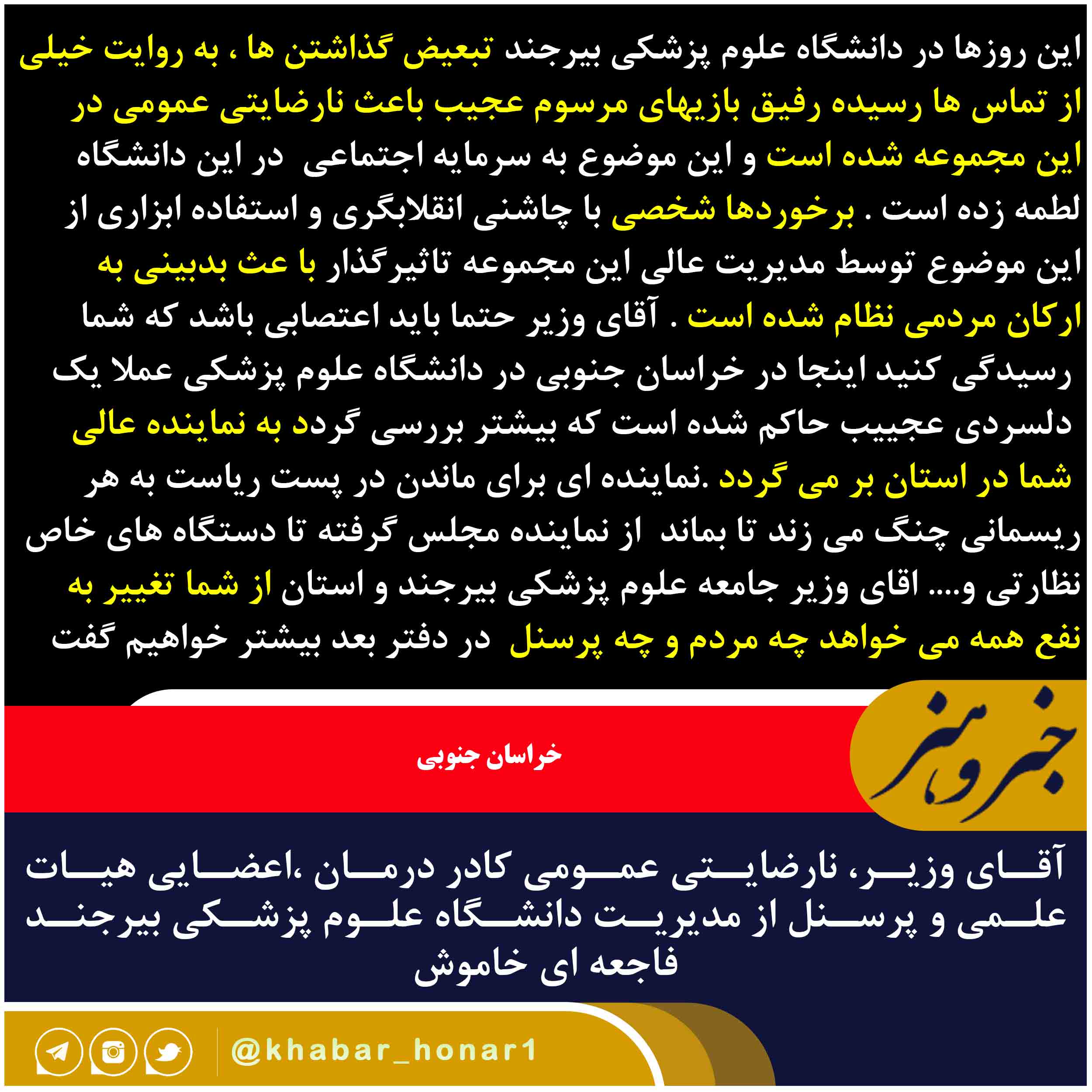 این روزها در دانشگاه علوم پزشکی بیرجند تبعیض گذاشتن ها ، به روایت خیلی از تماس ها رسیده رفیق بازیهای مرسوم عجیب باعث نارضایتی عمومی در این مجموعه شده است و این موضوع به سرمایه اجتماعی در این دانشگاه لطمه زده است . برخوردها شخصی با چاشنی انقلابگری و استفاده ابزاری از این موضوع توسط مدیریت عالی این مجموعه تاثیرگذار با عث بدبینی به ارکان مردمی نظام شده است . آقای وزیر حتما باید اعتصابی باشد که شما رسیدگی کنید اینجا در خراسان جنوبی در دانشگاه علوم پزشکی عملا یک دلسردی عجییب حاکم شده است که بیشتر بررسی گردد به نماینده عالی شما در استان بر می گردد .نماینده ای برای ماندن در پست ریاست به هر ریسمانی چنگ می زند تا بماند از نماینده مجلس گرفته تا دستگاه های خاص نظارتی و…. اقای وزیر جامعه علوم پزشکی بیرجند و استان از شما تغییر به نفع همه می خواهد چه مردم و چه پرسنل در دفتر بعد بیشتر خواهیم گفت