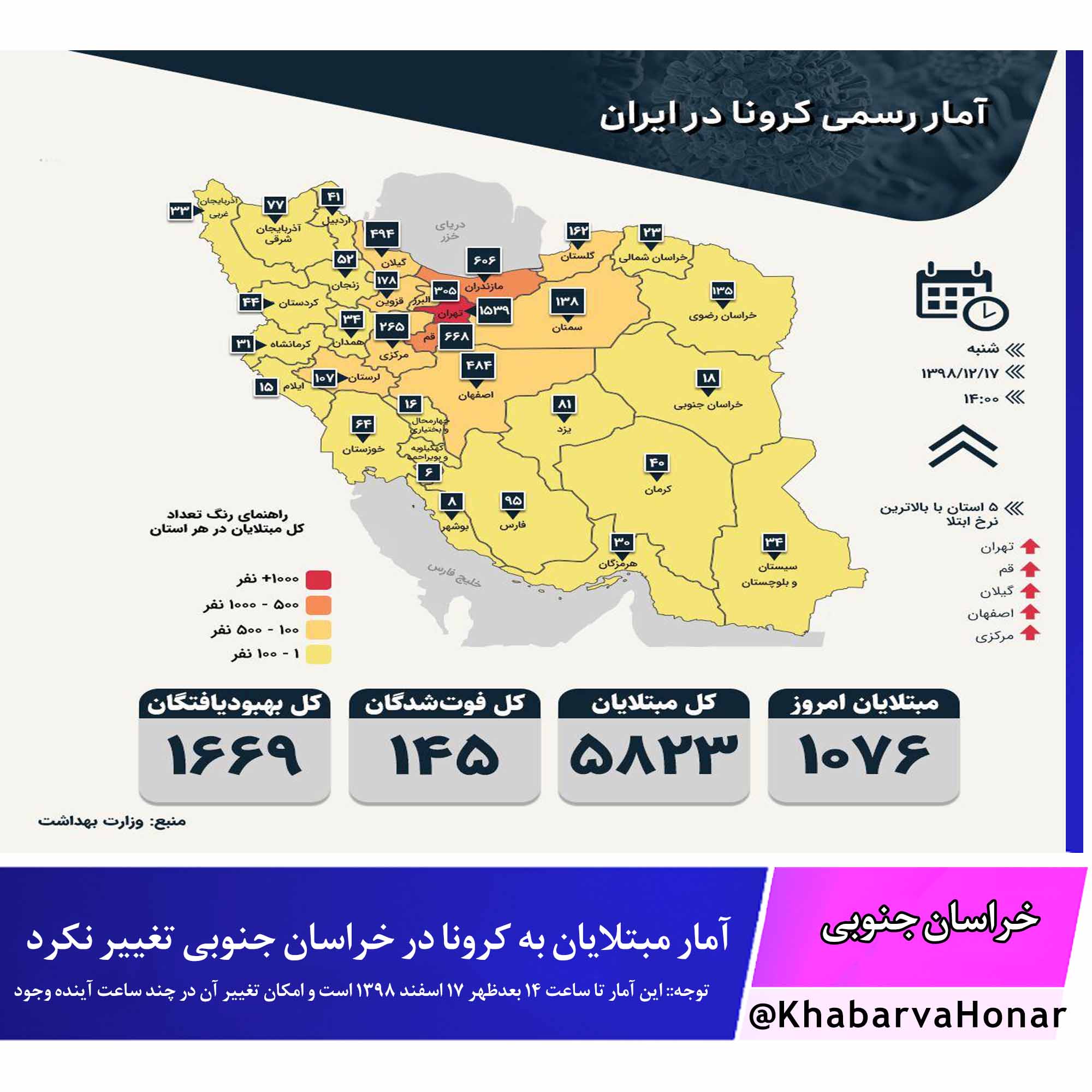 ? توجه:: این آمار تا ساعت ۱۴ بعدظهر ۱۷ اسفند ۱۳۹۸ است و امکان تغییر آن در چند ساعت آینده وجود دارد.