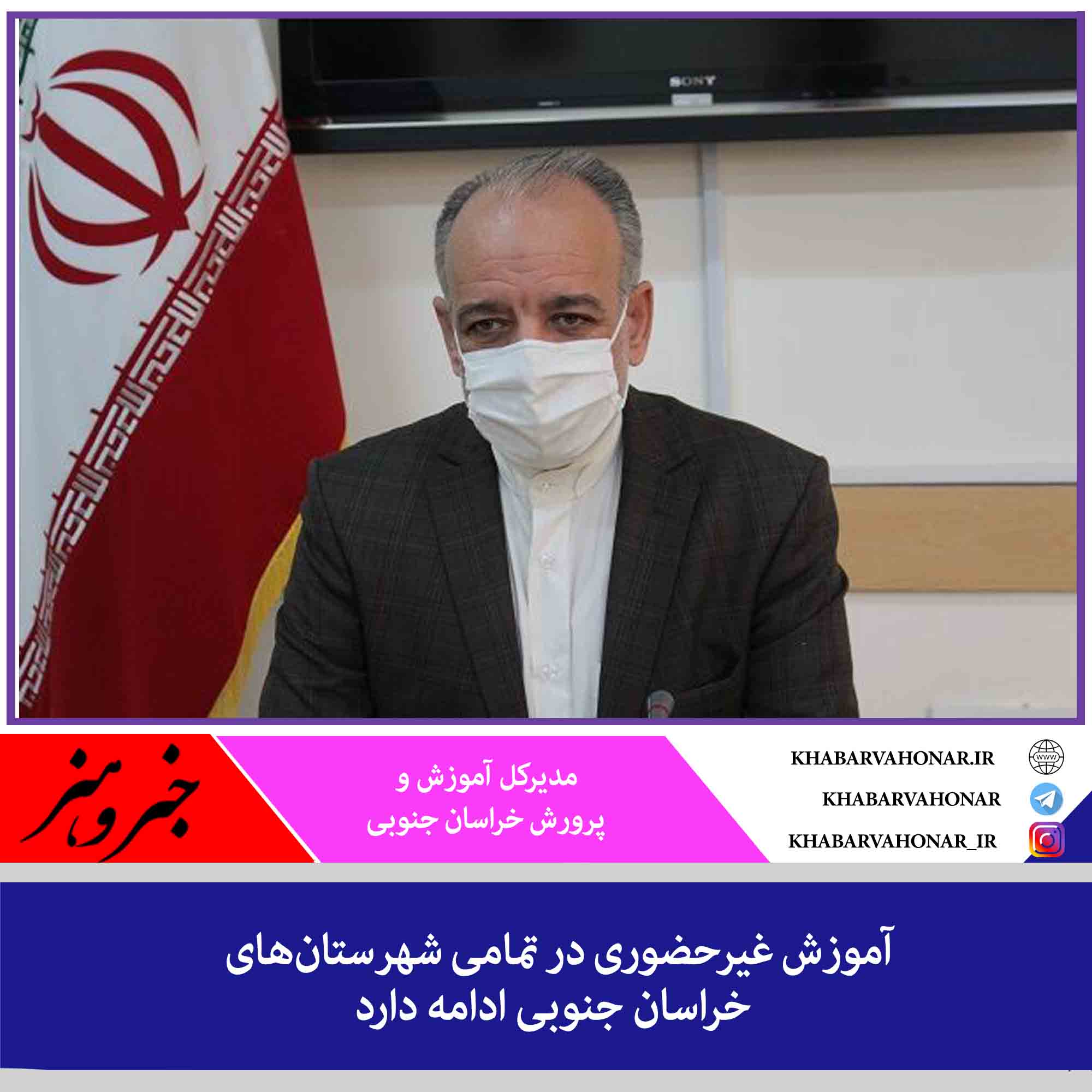 مدیرکل آموزش و پرورش خراسان جنوبی گفت: آموزش غیرحضوری در تمامی مدارس شهرستان‌های قرمز و نارنجی استان از شنبه ۱۵ آذر ماه به مدت یک هفته دیگر تمدید شد و حضور کادر اجرایی مدارس در شهرستان‌های نارنجی الزامی است.
