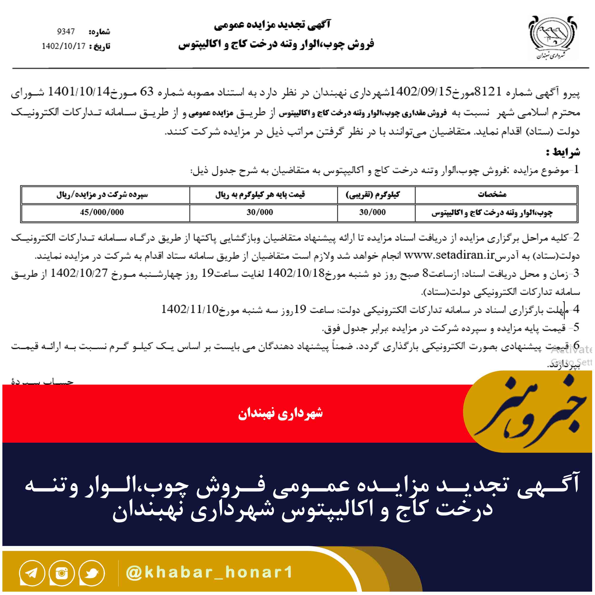 پیرو آگهی شماره ۸۱۲۱مورخ۱۵/۰۹/۱۴۰۲شهرداری نهبندان در نظر دارد به استناد مصوبه شماره ۶۳ مورخ۱۴/۱۰/۱۴۰۱ شورای محترم اسلامی شهر  نسبت به  فروش مقداری چوب،الوار وتنه درخت کاج و اکالیپتوس  از طریق مزایده عمومی و از طریق سامانه تدارکات الکترونیک دولت (ستاد) اقدام نماید. متقاضیان می‌توانند با در نظر گرفتن مراتب ذیل در مزایده شرکت کنند.