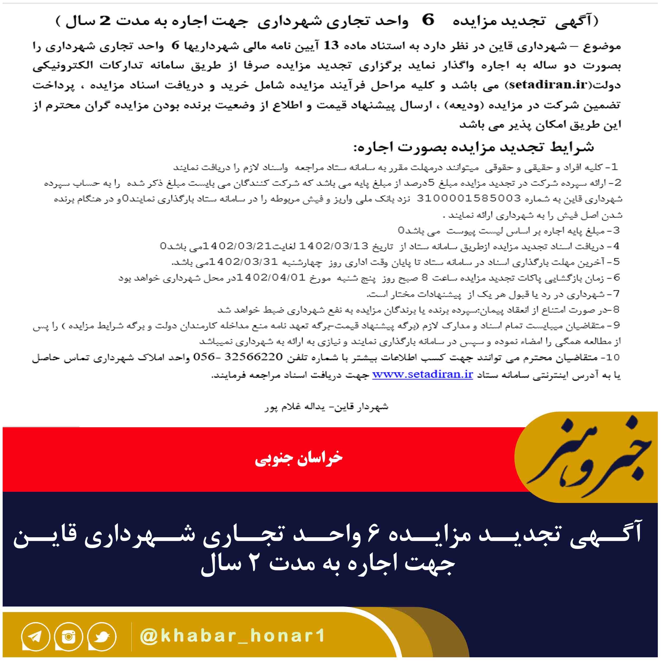 آگهی تجدید مزایده ۶ واحد تجاری شهرداری قاین جهت اجاره به مدت ۲ سال