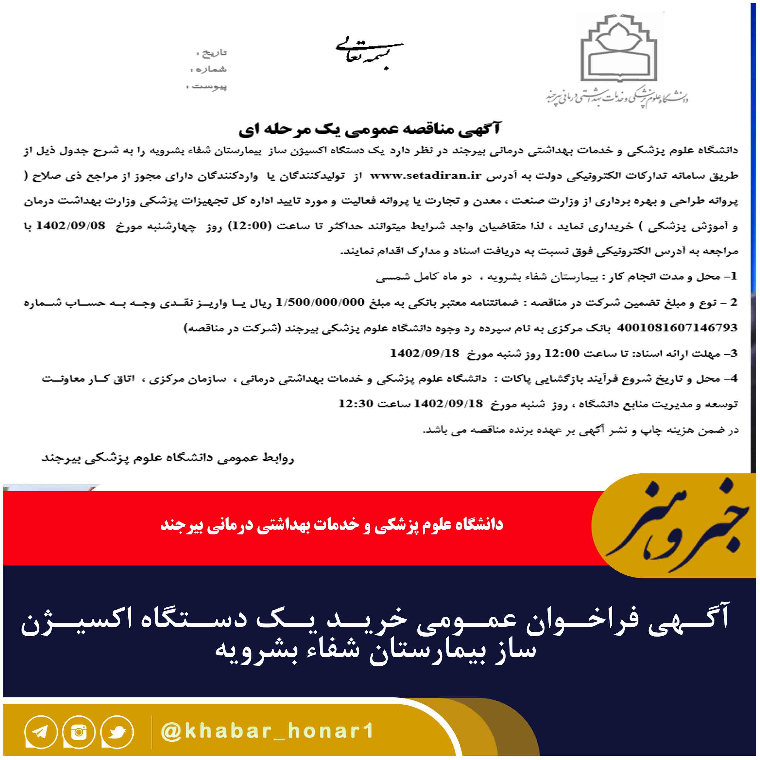 دانشگاه علوم پزشکی و خدمات بهداشتی درمانی بیرجند در نظر دارد یک دستگاه اکسیژن ساز بیمارستان شفاء بشرویه را به شرح جدول ذیل از طریق سامانه تدارکات الکترونیکی دولت به آدرس www.setadiran.ir از تولیدکنندگان یا واردکنندگان دارای مجوز از مراجع ذی صلاح ( پروانه طراحی و بهره برداری از وزارت صنعت ، معدن و تجارت یا پروانه فعالیت و مورد تایید اداره کل تجهیزات پزشکی وزارت بهداشت درمان و آموزش پزشکی ) خریداری نماید ، لذا متقاضیان واجد شرایط میتوانند حداکثر تا ساعت (۱۲:۰۰) روز چهارشنبه مورخ ۰۸/۰۹/۱۴۰۲ با مراجعه به آدرس الکترونیکی فوق نسبت به دریافت اسناد و مدارک اقدام نمایند.