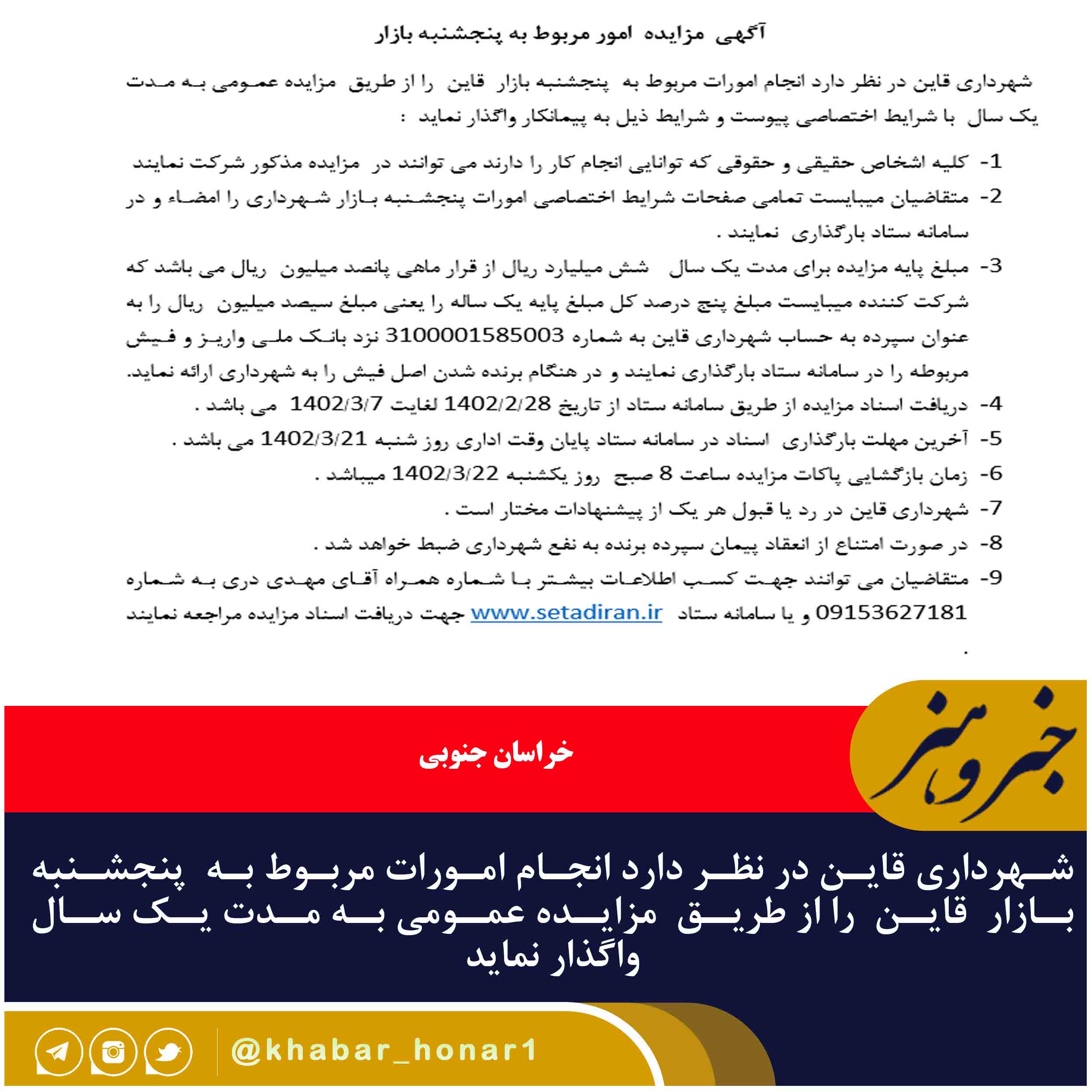 شهرداری قاین در نظر دارد انجام امورات مربوط به پنجشنبه بازار قاین را از طریق مزایده عمومی به مدت یک سال با شرایط اختصاصی پیوست و شرایط ذیل به پیمانکار واگذار نماید :