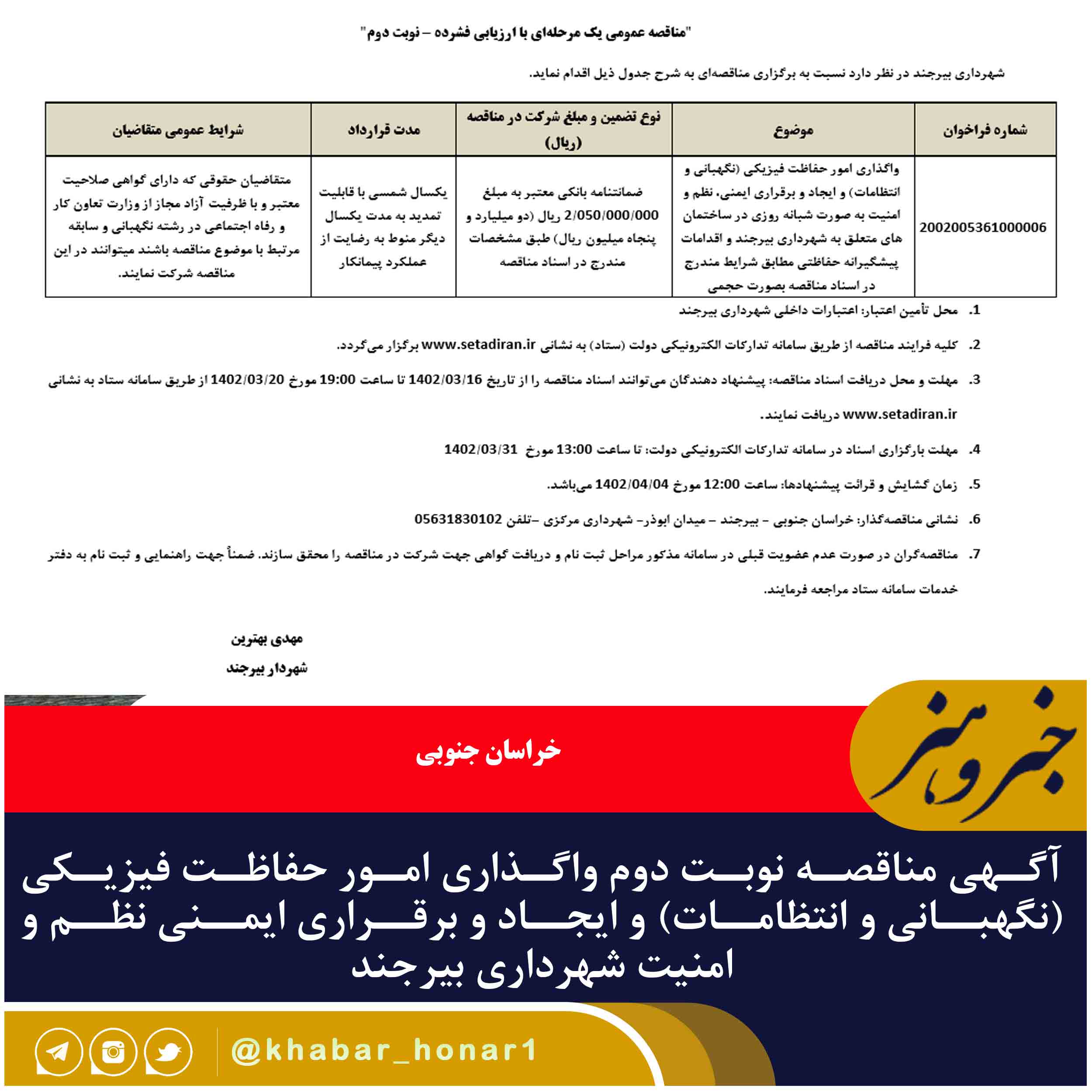 | ۲۰۰۲۰۰۵۳۶۱۰۰۰۰۰۶ | واگذاری امور حفاظت فیزیکی (نگهبانی و انتظامات) و ایجاد و برقراری ایمنی، نظم و امنیت به صورت شبانه روزی در ساختمان های متعلق به شهرداری بیرجند و اقدامات پیشگیرانه حفاظتی مطابق شرایط مندرج در اسناد مناقصه بصورت حجمی | ضمانتنامه بانکی معتبر به مبلغ ۰۰۰/۰۰۰/۰۵۰/۲ ریال (دو میلیارد و پنجاه میلیون ریال) طبق مشخصات مندرج در اسناد مناقصه | یکسال شمسی با قابلیت تمدید به مدت یکسال دیگر منوط به رضایت از عملکرد پیمانکار | متقاضیان حقوقی که دارای گواهی صلاحیت معتبر و با ظرفیت آزاد مجاز از وزارت تعاون کار و رفاه اجتماعی در رشته نگهبانی و سابقه مرتبط با موضوع مناقصه باشند میتوانند در این مناقصه شرکت نمایند. |
