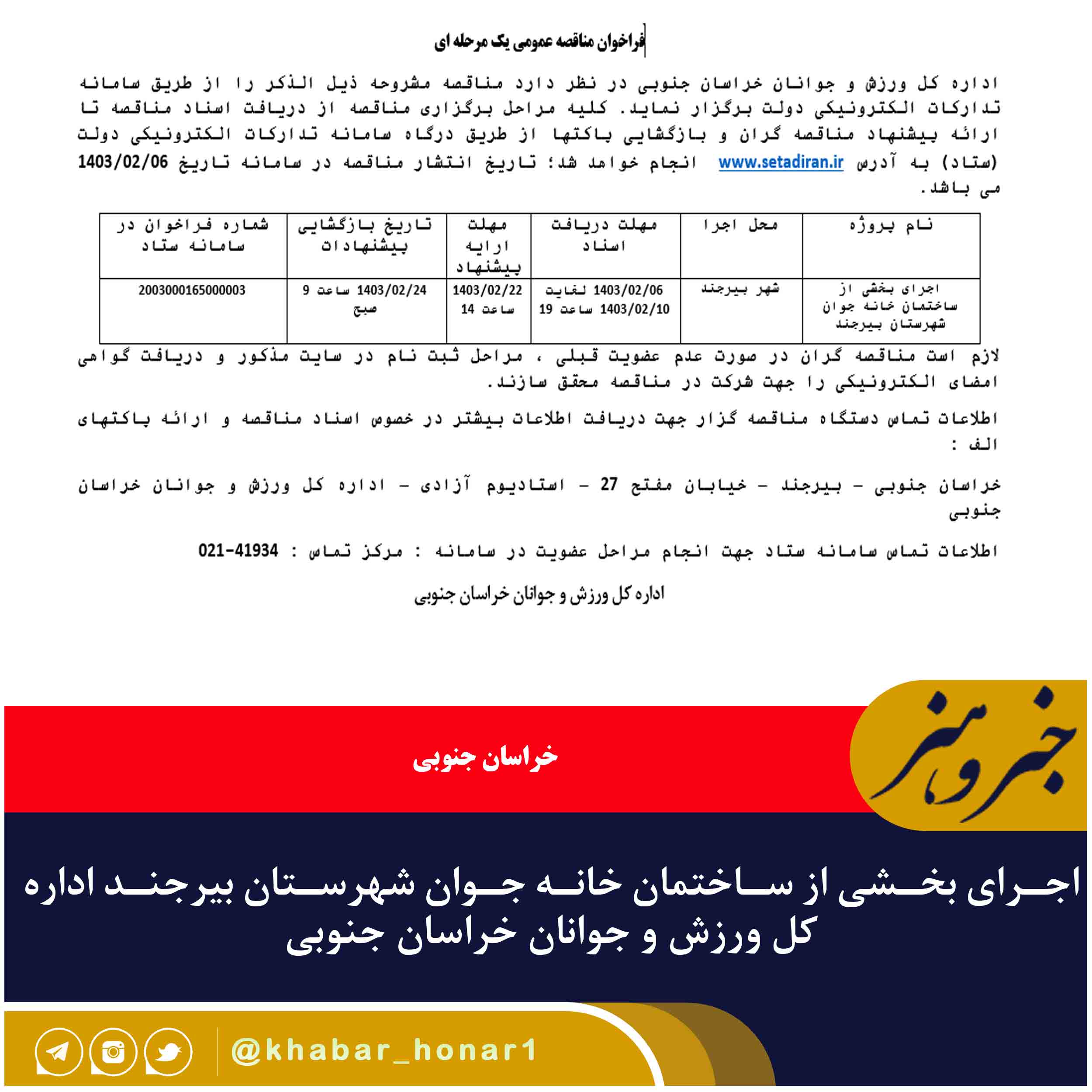 اداره کل ورزش و جوانان خراسان جنوبی در نظر دارد مناقصه مشروحه ذیل الذکر را از طریق سامانه تدارکات الکترونیکی دولت برگزار نماید. کلیه مراحل برگزاری مناقصه از دریافت اسناد مناقصه تا ارائه پیشنهاد مناقصه گران و بازگشایی پاکتها از طریق درگاه سامانه تدارکات الکترونیکی دولت (ستاد) به آدرس www.setadiran.ir انجام خواهد شد؛ تاریخ انتشار مناقصه در سامانه تاریخ ۰۶/۰۲/۱۴۰۳ می باشد.