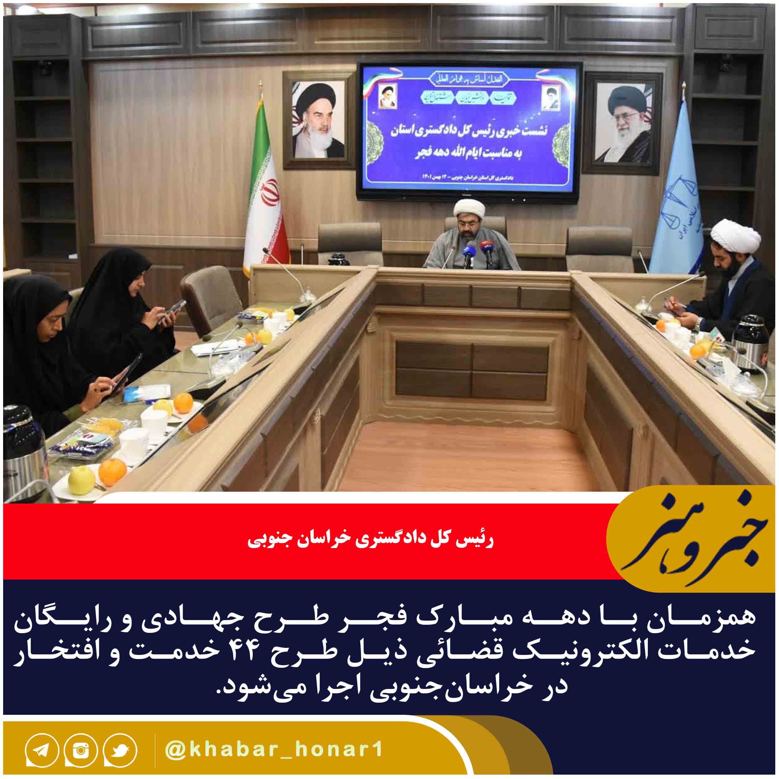 رئیس کل دادگستری خراسان جنوبی گفت: همزمان با دهه مبارک فجر طرح جهادی و رایگان خدمات الکترونیک قضائی ذیل طرح ۴۴ خدمت و افتخار در خراسانجنوبی اجرا میشود.