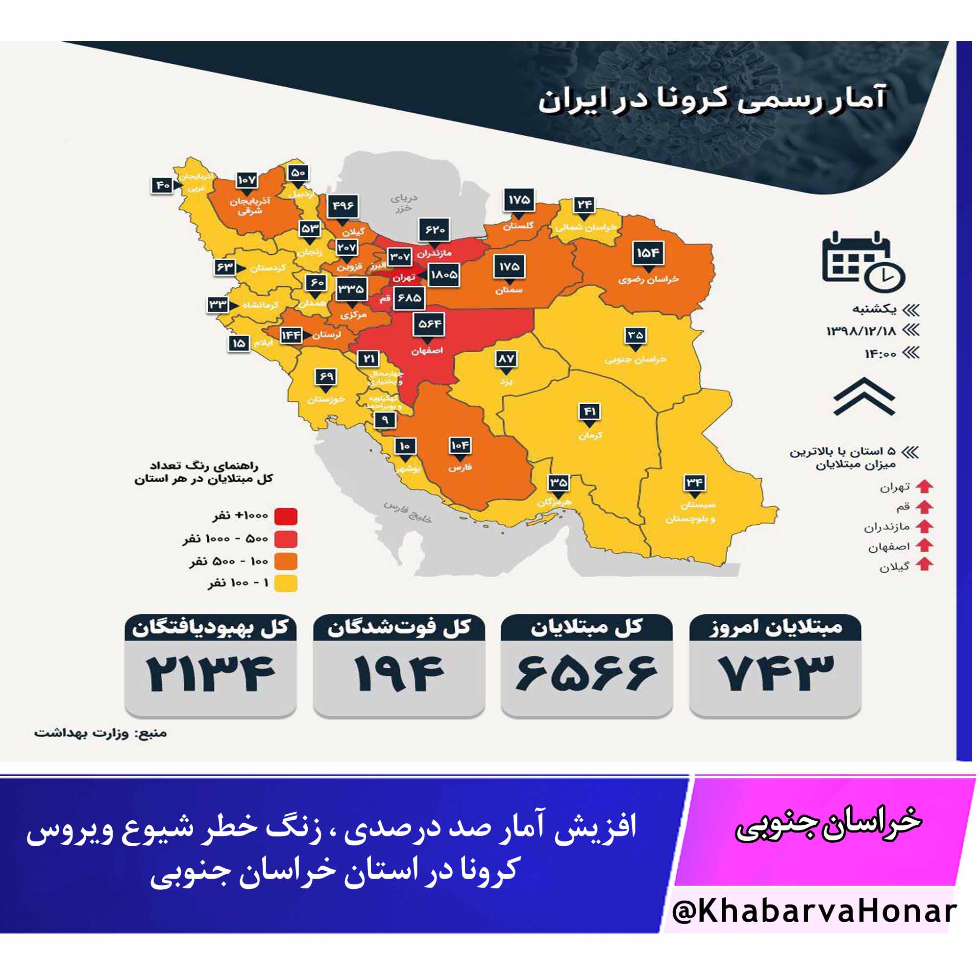 بر اساس آمار وزارت بهداشت، درمان و آموزش پزشکی میزان مبتلایان به کرونا در استان خراسان جنوبی از ۱۸ نفر در روز ۱۷ اسفندماه به ۳۵ نفر در روز جاری رسید .