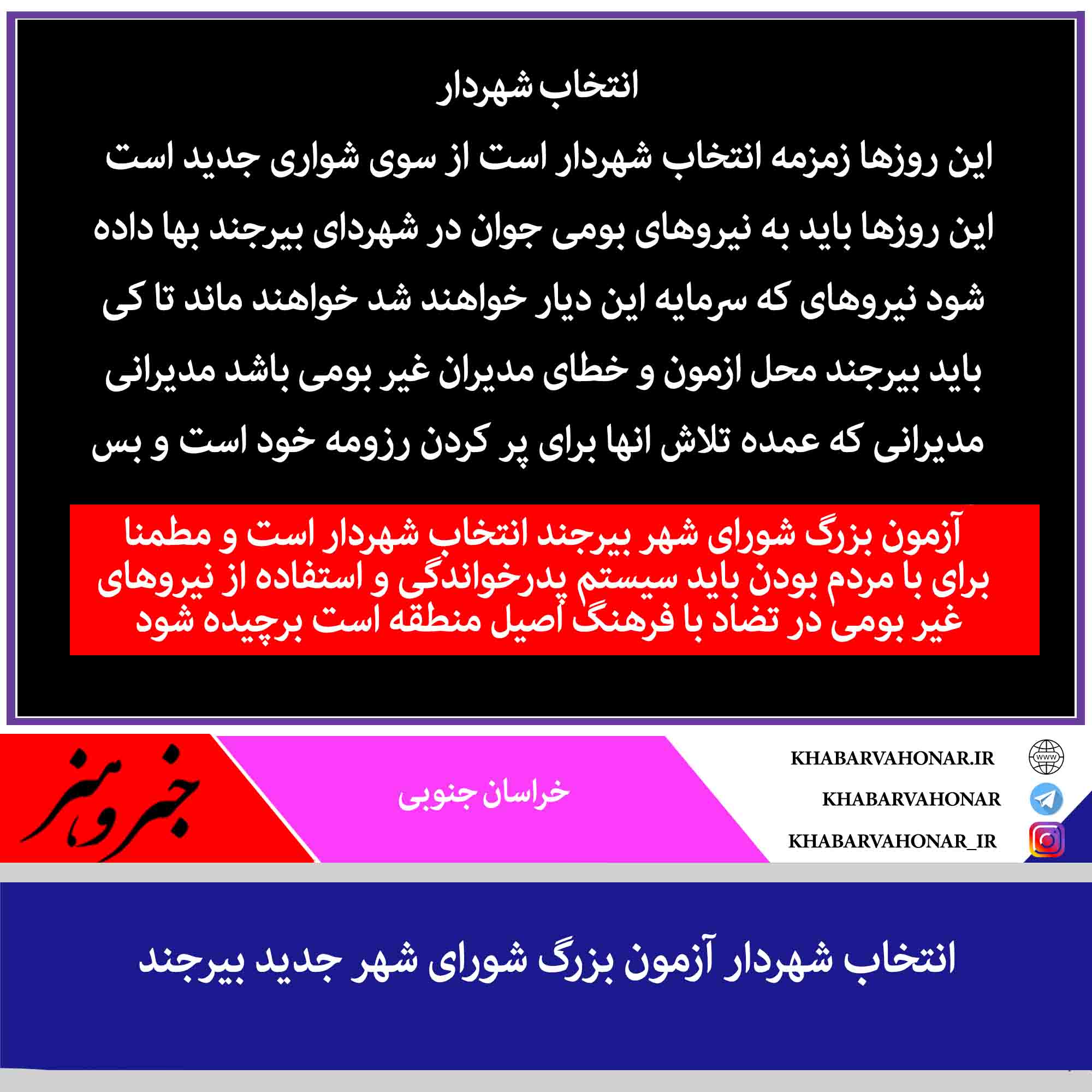 انتخاب شهردار این روزها زمزمه انتخاب شهردار است از سوی شواری جدید است این روزها باید به نیروهای بومی جوان در شهردای بیرجند بها داده شود نیروهای که سرمایه این دیار خواهند شد خواهند ماند تا کی باید بیرجند محل ازمون و خطای مدیران غیر بومی باشد مدیرانی مدیرانی که عمده تلاش انها برای پر کردن رزومه خود است و بس آزمون بزرگ شورای شهر بیرجند انتخاب شهردار است و مطمنا برای با مردم بودن باید سیستم پدرخواندگی و استفاده از نیروهای غیر بومی در تضاد با فرهنگ اصیل منطقه است برچیده شود