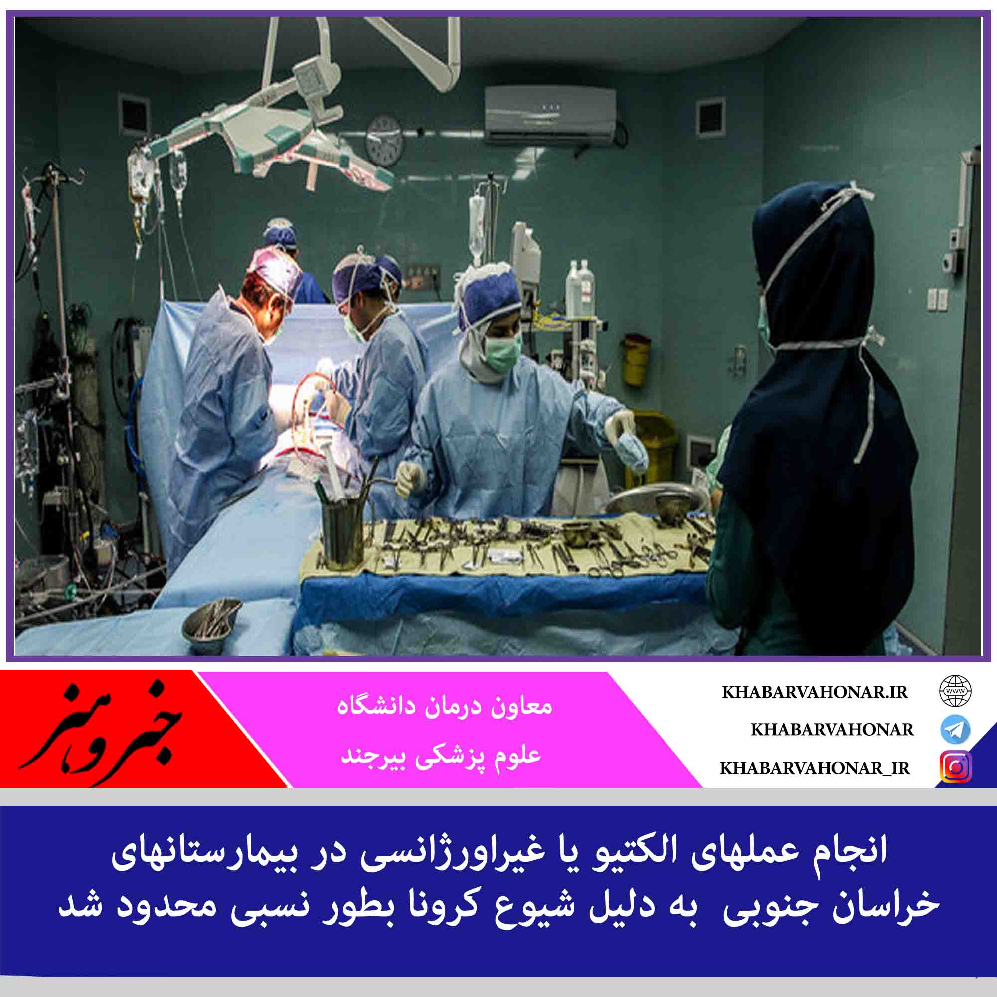 معاون درمان دانشگاه علوم پزشکی بیرجند اظهار کرد: انجام عملهای الکتیو یا غیراورژانسی در بیمارستانهای استان به دلیل شیوع کرونا بطور نسبی محدود شد.
