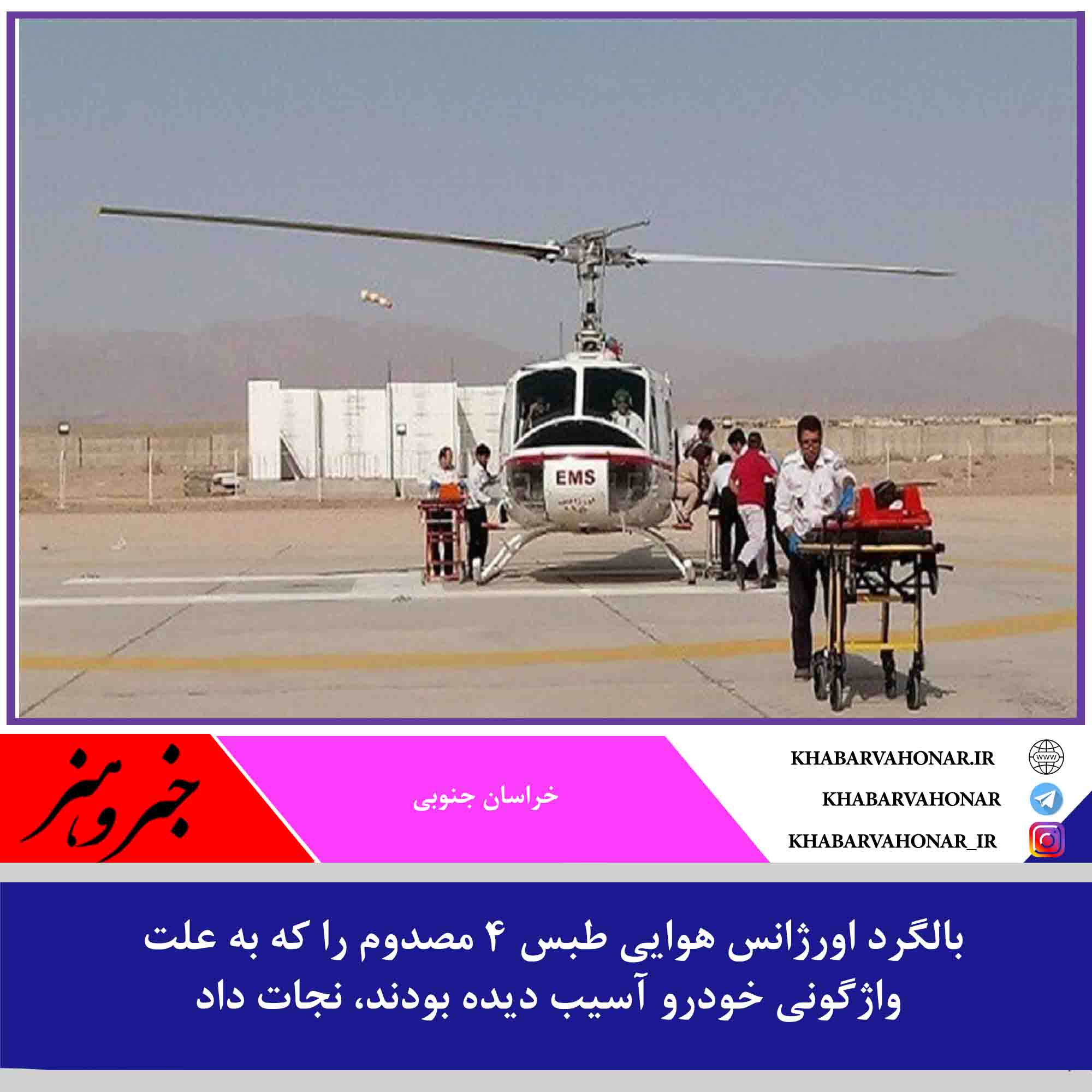 مسئول مرکز اورژانس ۱۱۵ شهرستان طبس گفت: بالگرد اورژانس هوایی طبس ۴ مصدوم را که به علت واژگونی خودرو آسیب دیده بودند، نجات داد.