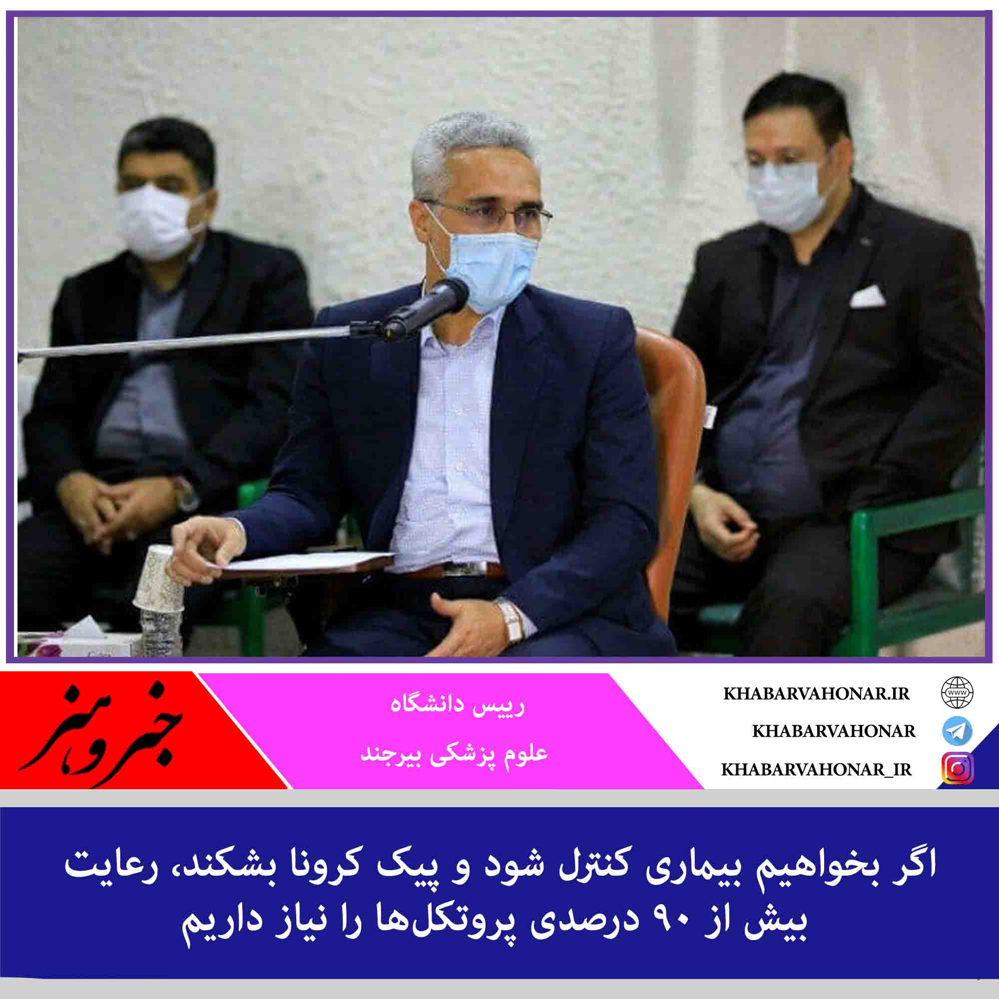 وی اظهار داشت: البته اگر بخواهیم بیماری کنترل شود و پیک کرونا بشکند، رعایت بیش از ۹۰ درصدی پروتکل‌ها را نیاز داریم که الان در خراسان جنوبی حدود ۷۱ درصد است.
