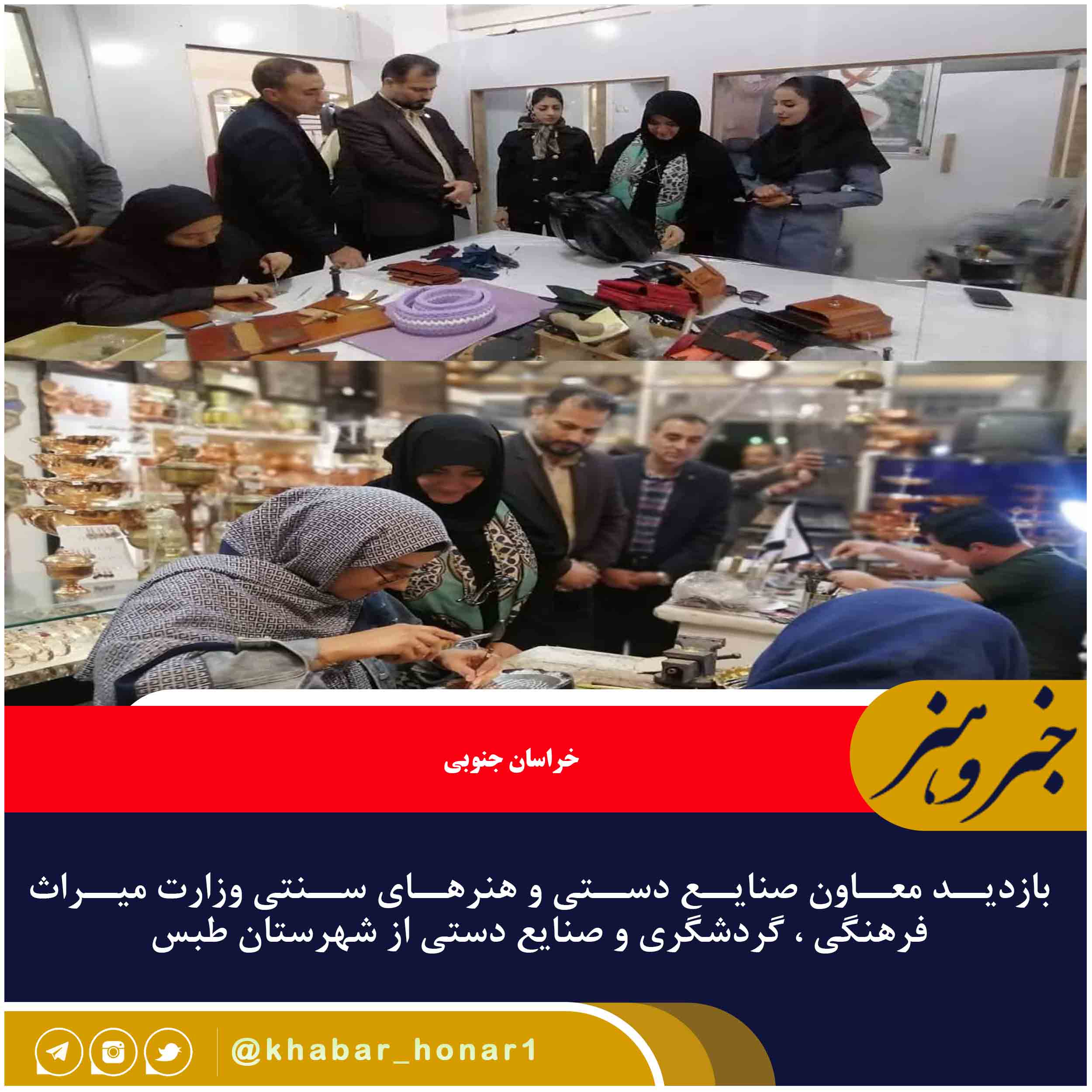 عرب رئیس میراث فرهنگی،گردشگری و صنایع دستی شهرستان طبس در بازدید از کارگاههای صنایع دستی گزارشی از رشته ها و فعالیت های صنایع دستی شهرستان طبس ارائه داد و گفت: مهارت قلم زنی ، مهارت گیوه بافی ، بوریا بافی یا سبد بافی ، مهارت مس گری و هنر پخل بافی در فهرست میراث معنوی کشور به ثبت رسیده و مس گری و قلم زنی دارای قدمت و پیشینه طولانی در شهر طبس می باشد و عده ی زیادی به این هنر اشتغال دارند یا دارای مهارت قلم زنی می باشند هر چند ممکن است مجوز و یا کارگاهی نداشته باشند.