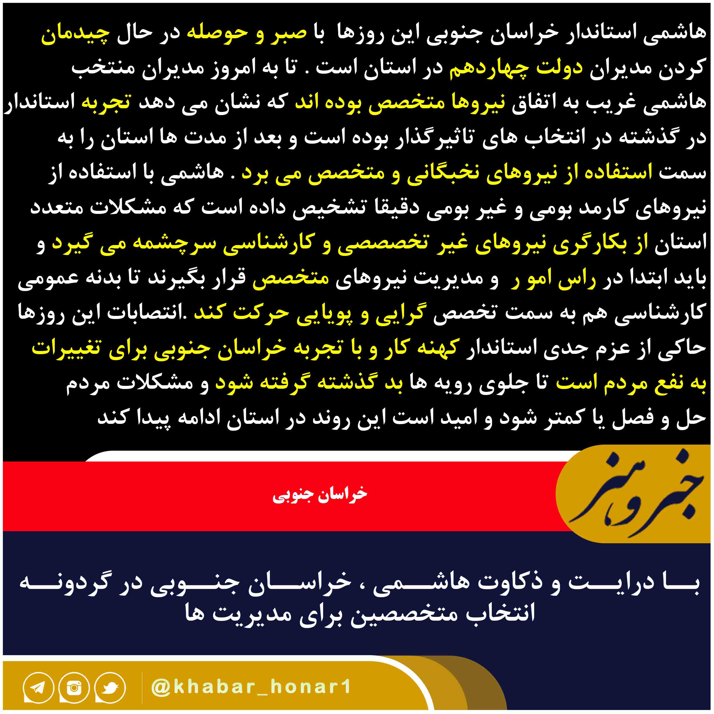 هاشمی استاندار خراسان جنوبی این روزها با صبر و حوصله در حال چیدمان کردن مدیران دولت چهاردهم در استان است . تا به امروز مدیران منتخب هاشمی غریب به اتفاق نیروها متخصص بوده اند که نشان می دهد تجربه استاندار در گذشته در انتخاب های تاثیرگذار بوده است و بعد از مدت ها استان را به سمت استفاده از نیروهای نخبگانی و متخصص می برد . هاشمی با استفاده از نیروهای کارمد بومی و غیر بومی دقیقا تشخیص داده است که مشکلات متعدد استان از بکارگری نیروهای غیر تخصصصی و کارشناسی سرچشمه می گیرد و باید ابتدا در راس امو ر و مدیریت نیروهای متخصص قرار بگیرند تا بدنه عمومی کارشناسی هم به سمت تخصص گرایی و پویایی حرکت کند .انتصابات این روزها حاکی از عزم جدی استاندار کهنه کار و با تجربه خراسان جنوبی برای تغییرات به نفع مردم است تا جلوی رویه ها بد گذشته گرفته شود و مشکلات مردم حل و فصل یا کمتر شود و امید است این روند در استان ادامه پیدا کند