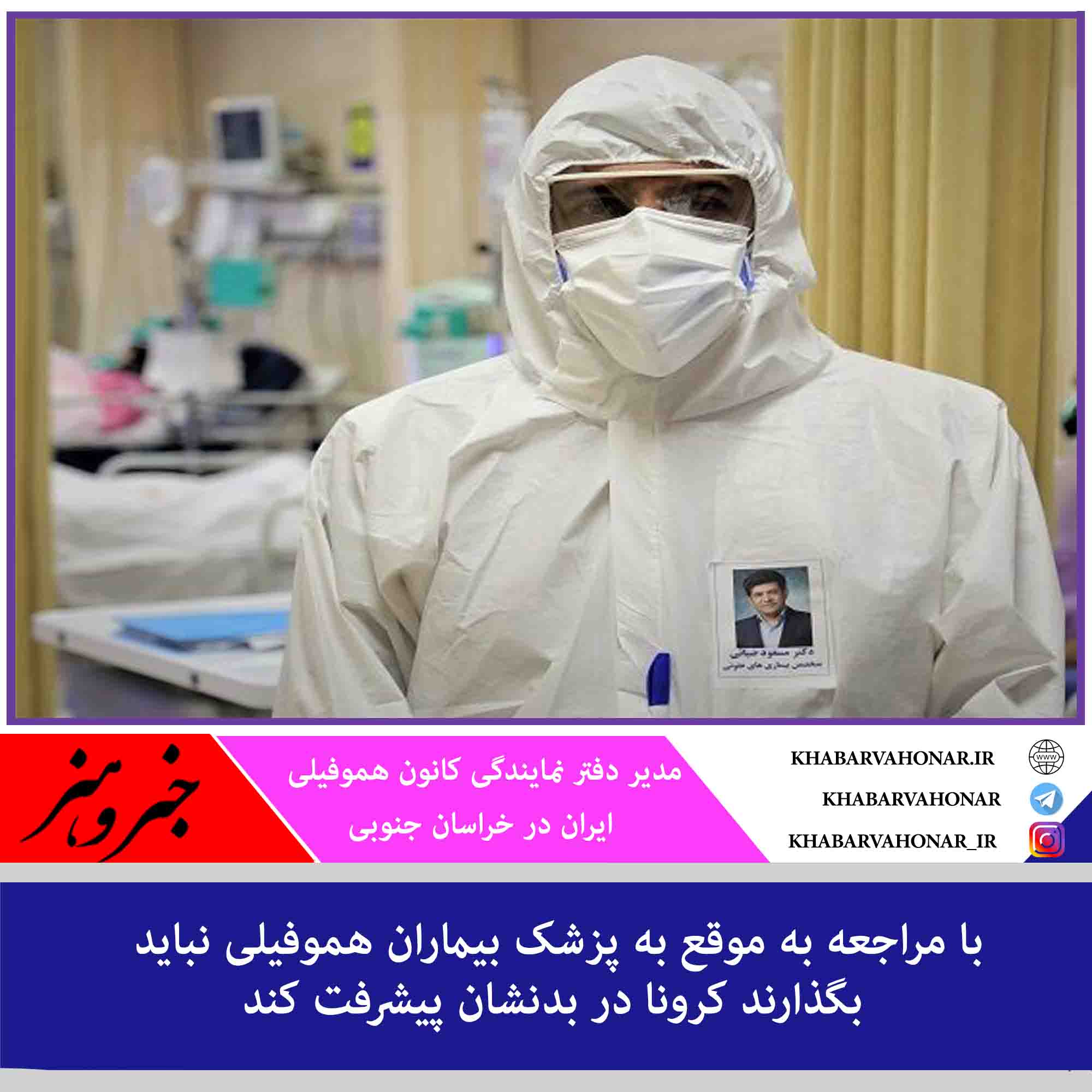 مدیر دفتر نمایندگی کانون هموفیلی ایران در خراسان جنوبی بیان کرد: اگر یک فرد عادی مبتلا شد و فقط یک تب خفیف و سرفه سبک و علائم بسیار خفیفی داشت، میتواند با یک مسکن مثل استامینوفن و یا قرصهای ضدالتهاب، آن را برطرف کند اما در بیماران هموفیلی نباید این داروها مصرف شود و فرد بیمار باید علائم درمانی را چک کند، اگر این علائم ایجاد شد یا تب سه الی چهار روز طول کشید و قطع نشد باید حتماً به پزشک مراجعه کرد.