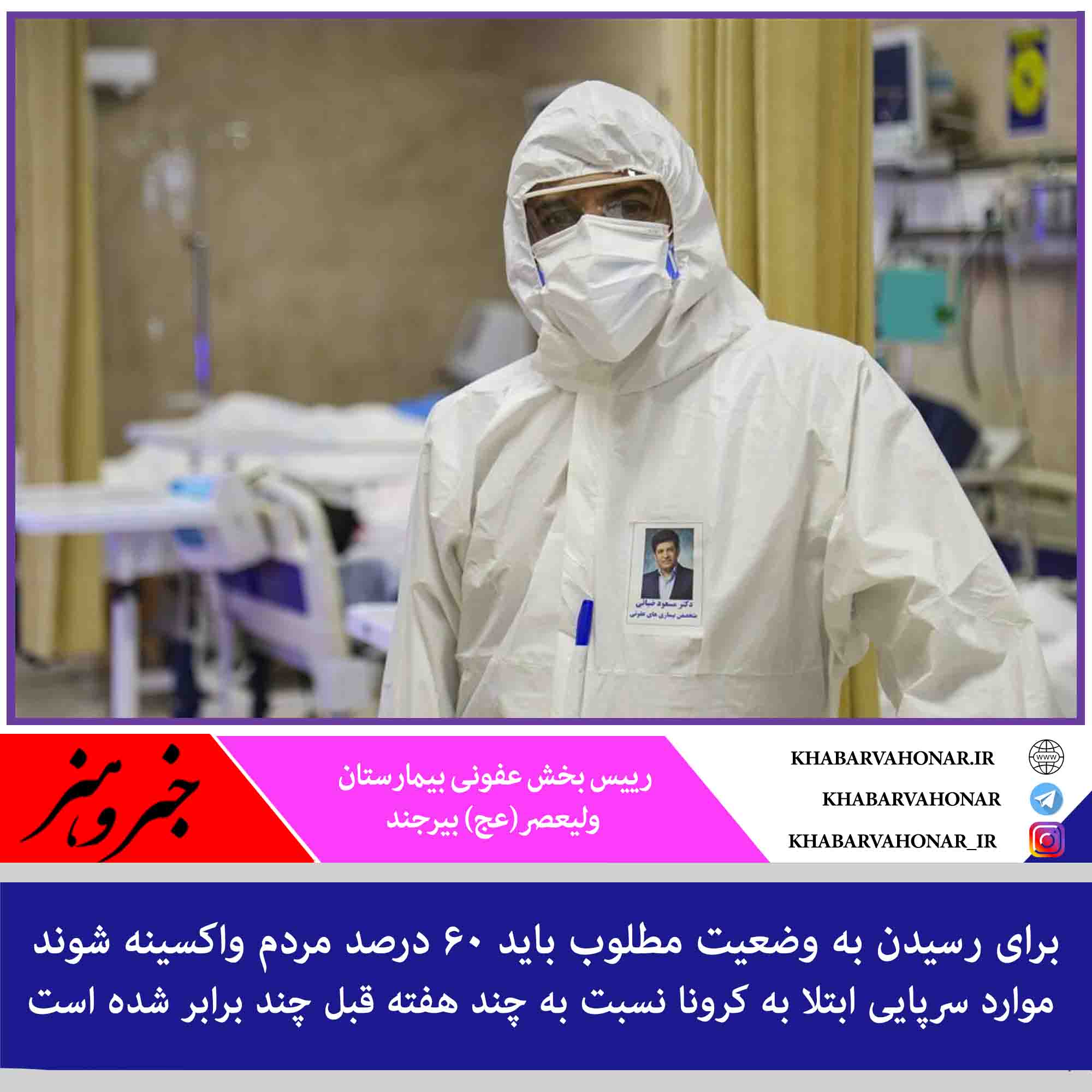 رییس بخش عفونی بیمارستان ولیعصر(عج) بیرجند با بیان اینکه یکی از اقداماتی که برای جلوگیری از شیوع کرونا باید همچنان صورت گیرد تصمیم مدیران و اطلاع رسانی تصمیمات به مردم است، گفت: برای رسیدن به وضعیت مطلوب باید ۶۰ درصد واکسینه شوند؛ لذا لازم است در مورد واکسن، آنهایی که تاییدیه دارد از هر جا که ممکن است تهیه شود.