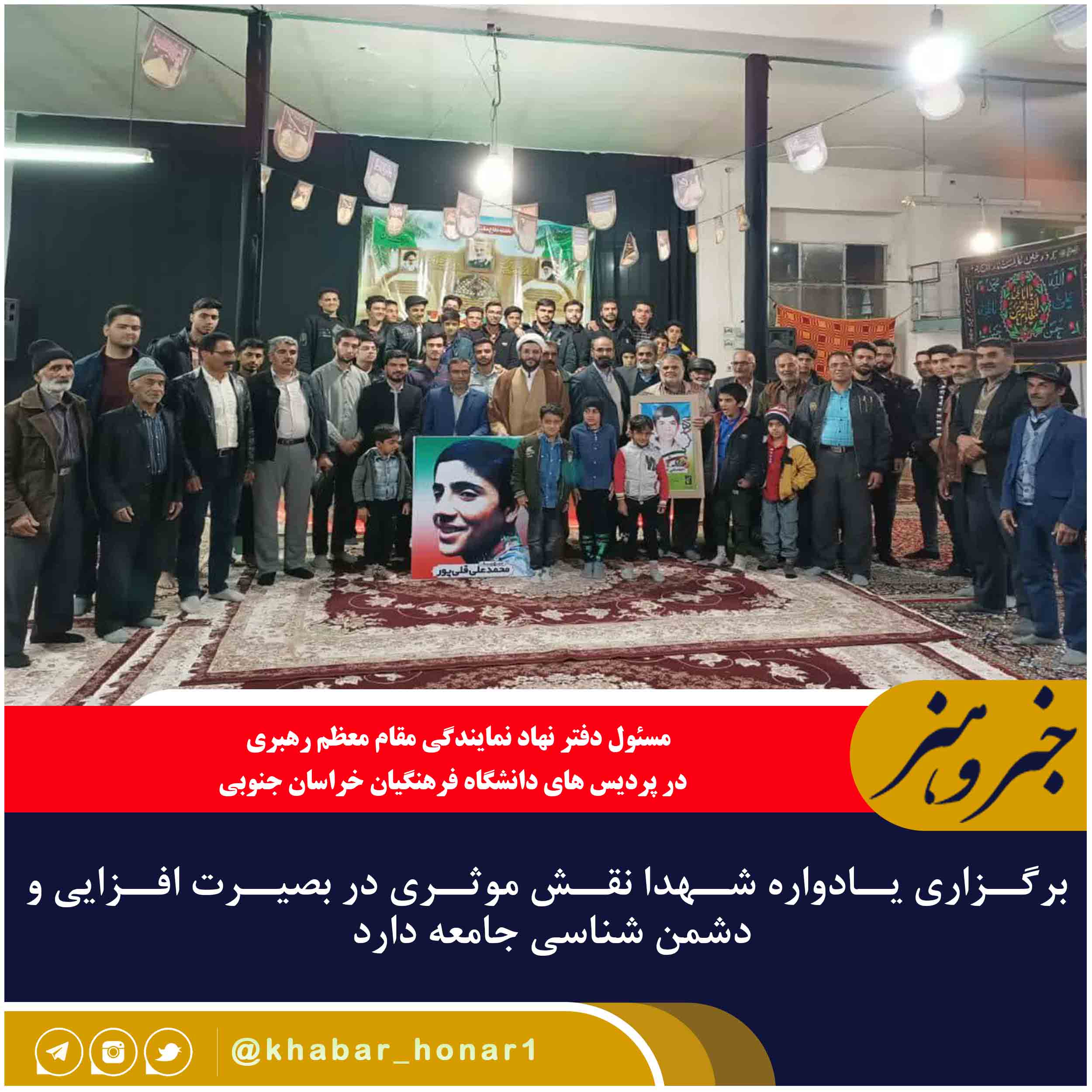 مسئول دفترنهاد نمایندگی مقام معظم رهبری در پردیس های دانشگاه فرهنگیان خراسان جنوبی ادامه داد: برگزاری یادواره شهدا نقش موثری در روشنگری بصیرت افزایی و دشمن شناسی جامعه دارد و زمینه آشنایی جوانان و نسل جوان را با افکار شهدا و اهداف آن ها را فراهم می کند.