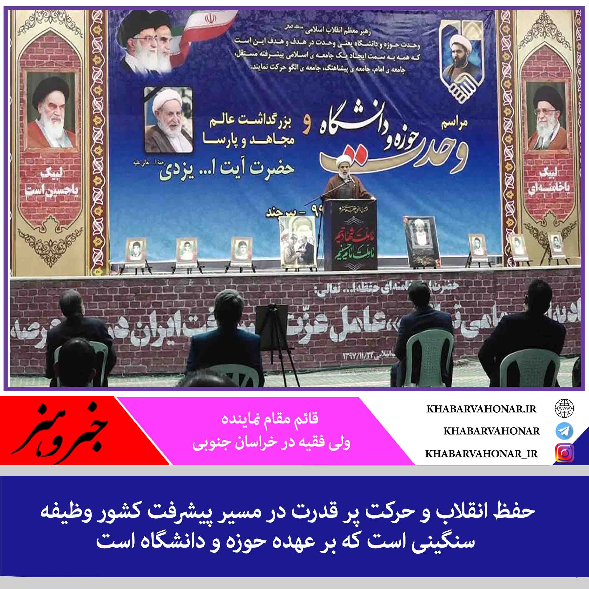 حفظ انقلاب و حرکت پر قدرت در مسیر پیشرفت کشور وظیفه سنگینی است که بر عهده حوزه و دانشگاه است.