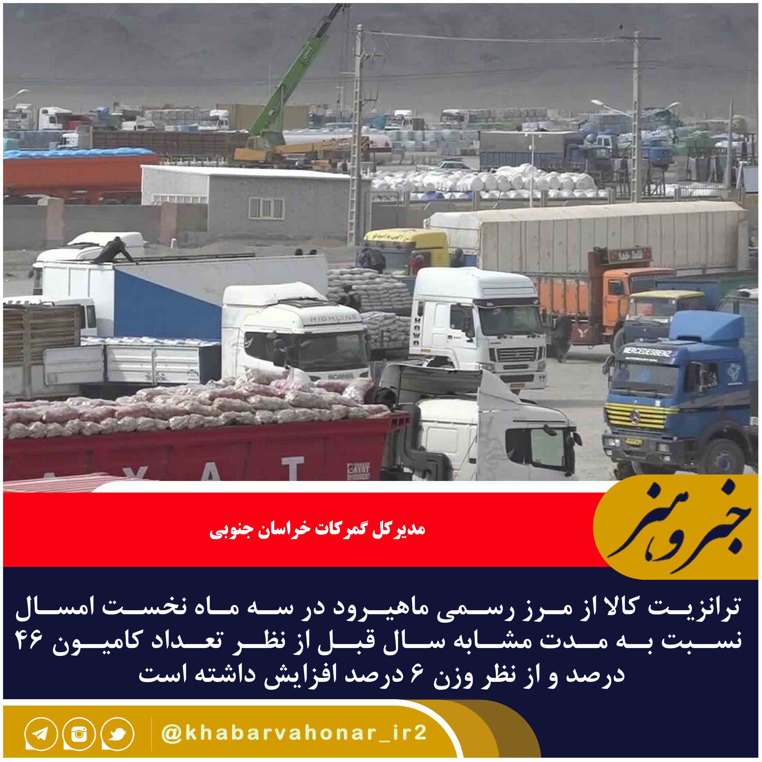 مدیرکل گمرکات خراسان جنوبی گفت: ترانزیت کالا از مرز رسمی ماهیرود در سه ماه نخست امسال نسبت به مدت مشابه سال قبل از نظر تعداد کامیون ۴۶ درصد و از نظر وزن ۶ درصد افزایش داشته است.