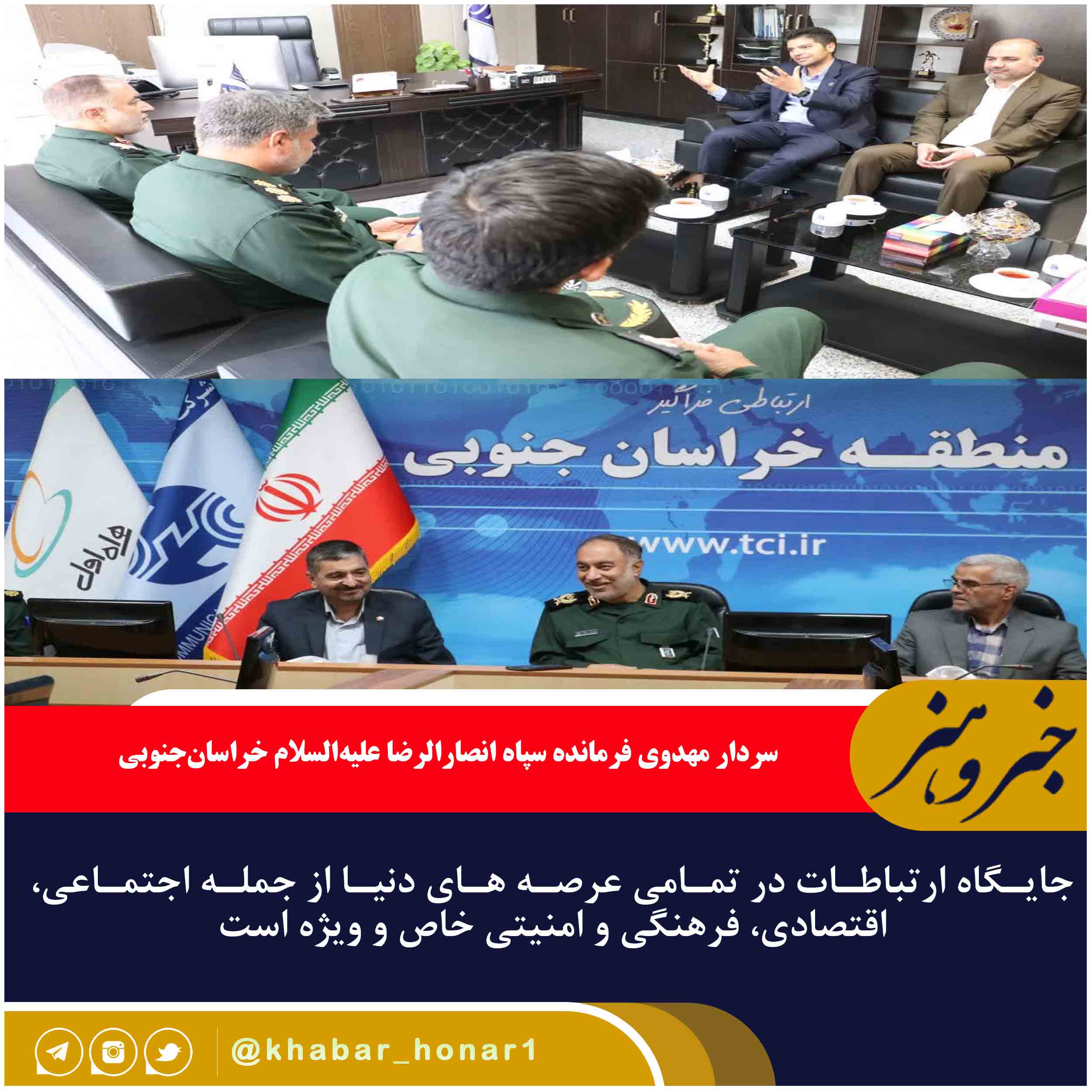 سردار مهدوی فرمانده سپاه انصارالرضا علیهالسلام خراسانجنوبی امروز در دیدار با مدیر کل اداره فناوری اطلاعات و ارتباطات خراسان جنوبی و مدیر کل مخابرات استان به مناسبت روز ارتباطات، ضمن تبریک این ایام بیان کرد: امروز نقش ارتباطات و مخابرات بر هیچ فردی پوشیده نیست و جایگاه ارتباطات در تمامی عرصه های دنیا از جمله اجتماعی، اقتصادی، فرهنگی و امنیتی خاص و ویژه است.