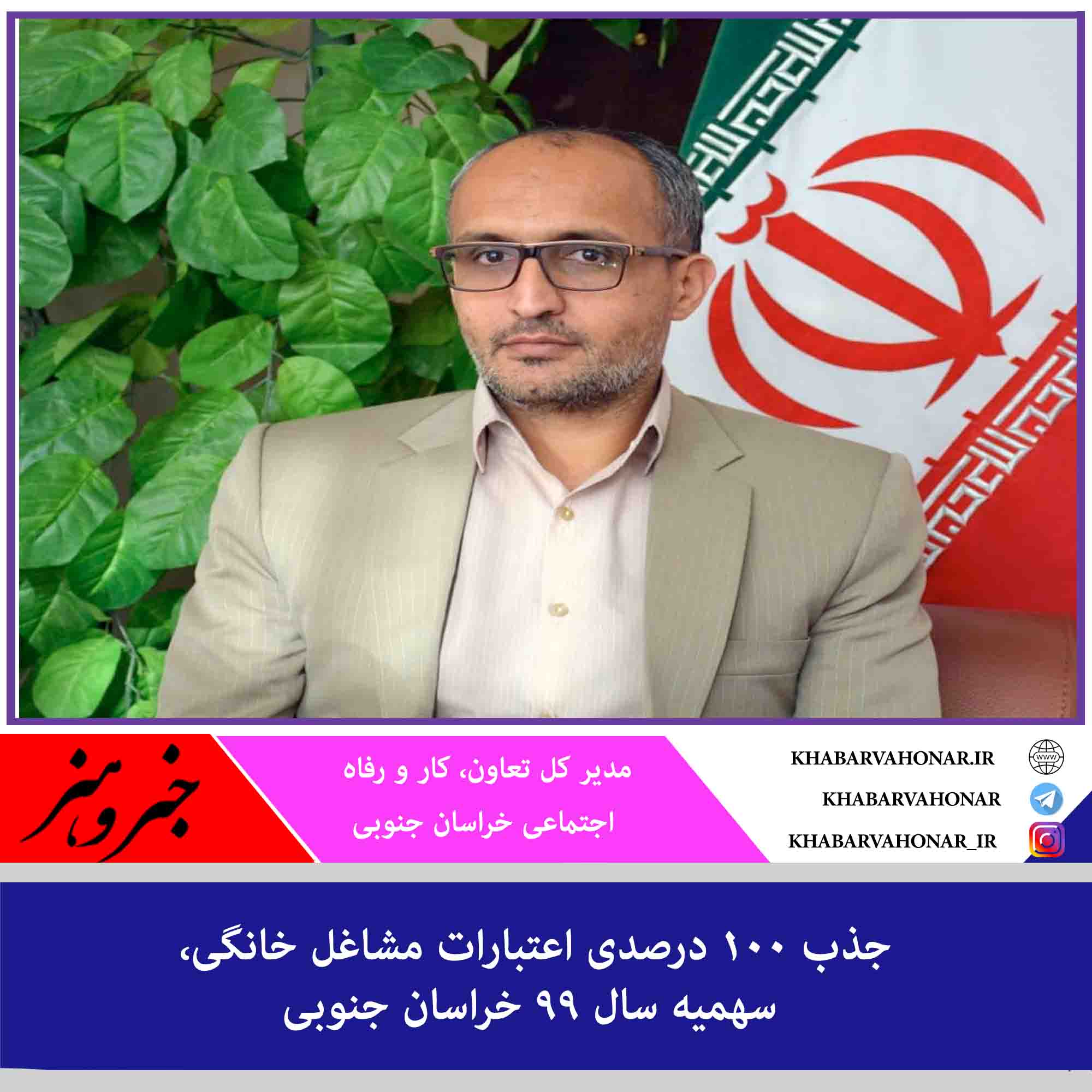 مدیر کل تعاون، کار و رفاه اجتماعی خراسان جنوبی از جذب ۱۰۰ درصدی اعتبارات مشاغل خانگی سهمیه سال ۹۹ در استان خبر داد .