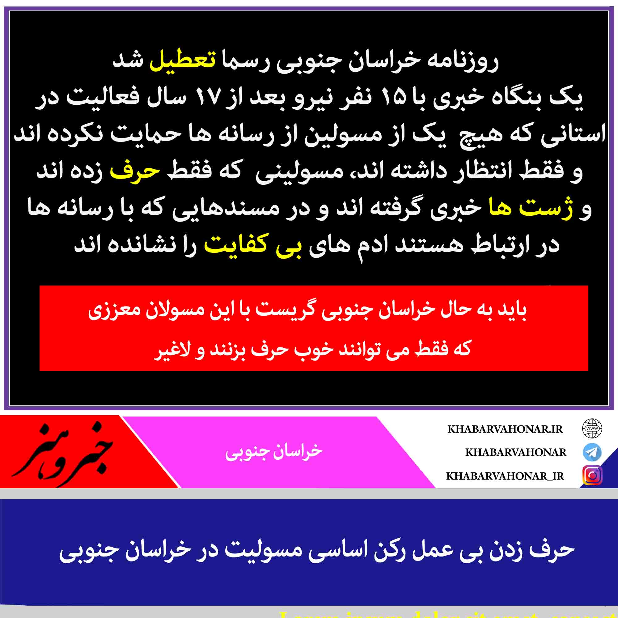 روزنامه خراسان جنوبی رسما تعطیل شد یک بنگاه خبری با ۱۵ نفر نیرو بعد از ۱۷ سال فعالیت در استانی که هیچ یک از مسولین از رسانه ها حمایت نکرده اند و فقط انتظار داشته اند، مسولینی که فقط حرف زده اند و ژست ها خبری گرفته اند و در مسندهایی که با رسانه ها در ارتباط هستند ادم های بی کفایت را نشانده اند