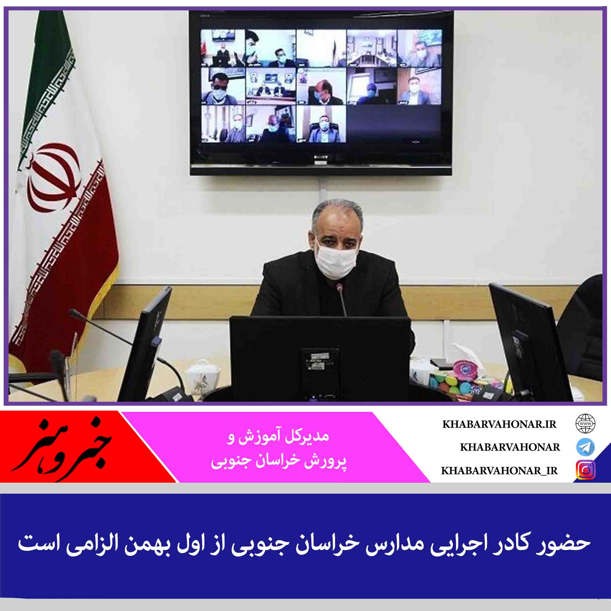 مدیرکل آموزش و پرورش خراسان جنوبی گفت: با توجه به قرار گرفتن استان در شرایط زرد و آبی، کادر اداری و اجرایی تمامی مدارس استان از اول بهمن ماه موظف به حضور در مدارس هستند.