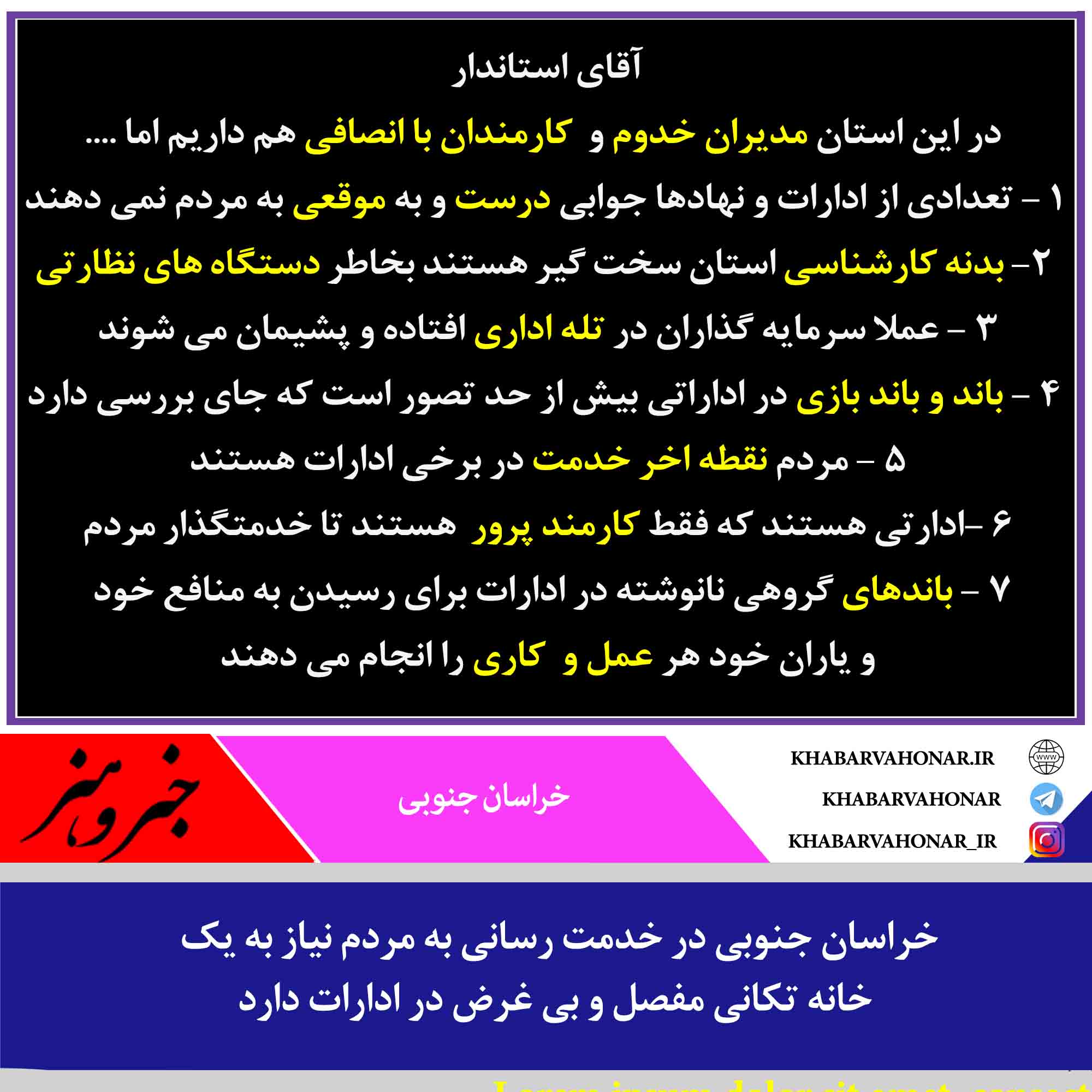آقای استاندار در این استان مدیران خدوم و کارمندان با انصافی هم داریم اما …. ۱ – تعدادی از ادارات و نهادها جوابی درست و به موقعی به مردم نمی دهند ۲- بدنه کارشناسی استان سخت گیر هستند بخاطر دستگاه های نظارتی ۳ – عملا سرمایه گذاران در تله اداری افتاده و پشیمان می شوند ۴ – باند و باند بازی در اداراتی بیش از حد تصور است که جای بررسی دارد ۵ – مردم نقطه اخر خدمت در برخی ادارات هستند ۶ -ادارتی هستند که فقط کارمند پرور هستند تا خدمتگذار مردم ۷ – باندهای گروهی نانوشته در ادارات برای رسیدن به منافع خود و یاران خود هر عمل و کاری را انجام می دهند