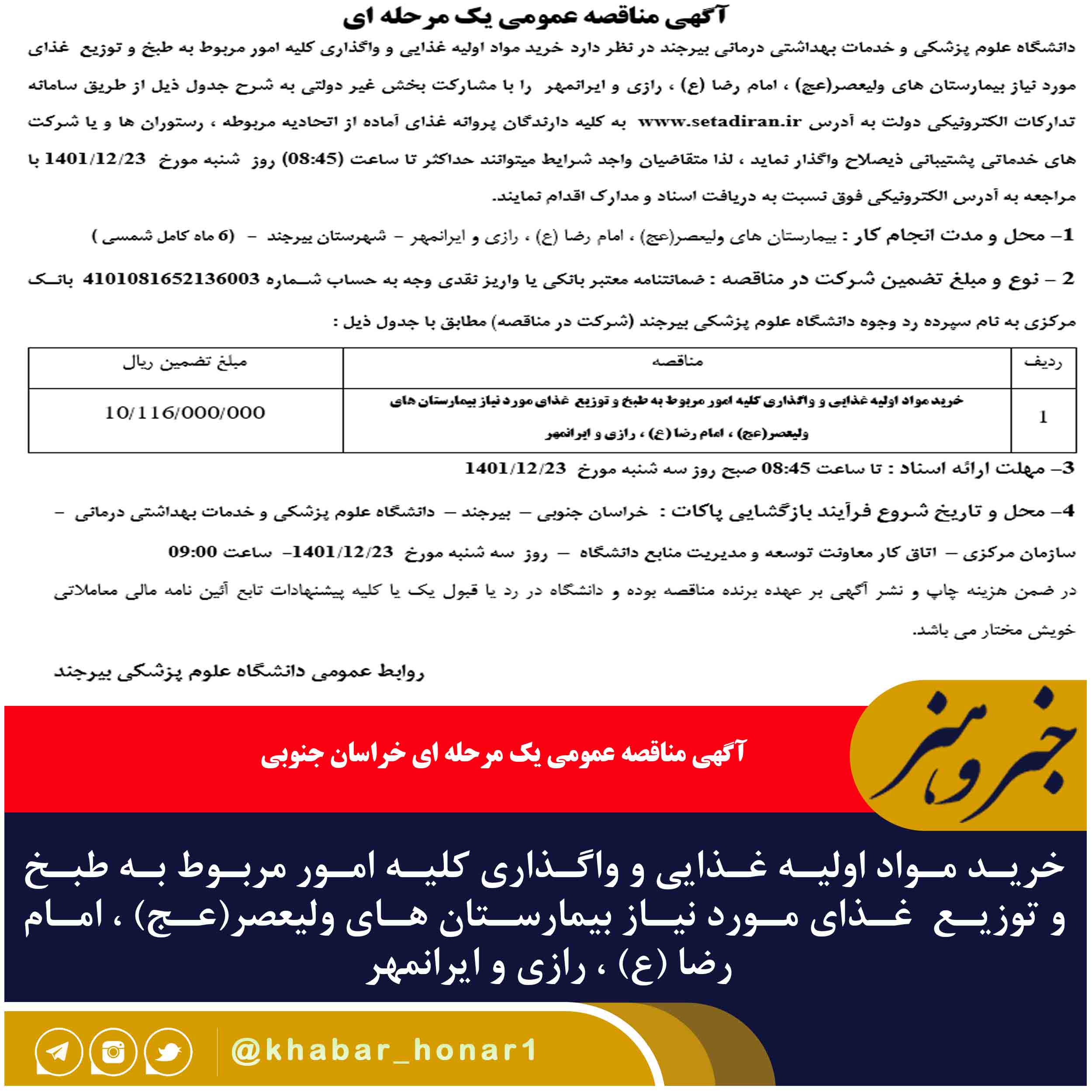 دانشگاه علوم پزشکی و خدمات بهداشتی درمانی بیرجند در نظر دارد خرید مواد اولیه غذایی و واگذاری کلیه امور مربوط به طبخ و توزیع  غذای مورد نیاز بیمارستان های ولیعصر(عج) ، امام رضا (ع) ، رازی و ایرانمهر  را با مشارکت بخش غیر دولتی به شرح جدول ذیل از طریق سامانه تدارکات الکترونیکی دولت به آدرس www.setadiran.ir  به کلیه دارندگان پروانه غذای آماده از اتحادیه مربوطه ، رستوران ها و یا شرکت های خدماتی پشتیبانی ذیصلاح واگذار نماید ، لذا متقاضیان واجد شرایط میتوانند حداکثر تا ساعت (۰۸:۴۵) روز  شنبه مورخ  ۲۳/۱۲/۱۴۰۱ با مراجعه به آدرس الکترونیکی فوق نسبت به دریافت اسناد و مدارک اقدام نمایند.