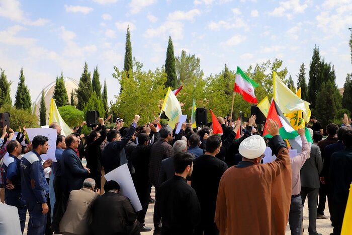 دانشجویان و اساتید با در دست داشتن پرچمهای ایران، فلسطین و حزب الله شعارهایی از جمله مرگ بر منافق، مرگ بر آمریکا، مرگ بر اسرائیل، “سید حسن نصرالله یار همه مظلومان، سید حسن نصرالله سرباز راه قرآن”، “اسرائیل نابود است مقاومت پیروز است”، “اسراییل نابود است حزب الله پیروز است”، مرگ بر صهیونیست، “ای رهبر آزاده آمادهایم آماده”، “وای اگر خامنهای حکم جهادم دهد”، “سپاهی، ارتشی، انتقام انتقام”، مرگ بر آل یهود ظالم، “نصر من الله و فتح القریب مرگ بر اسرائیل مردم فریب” سر دادند.