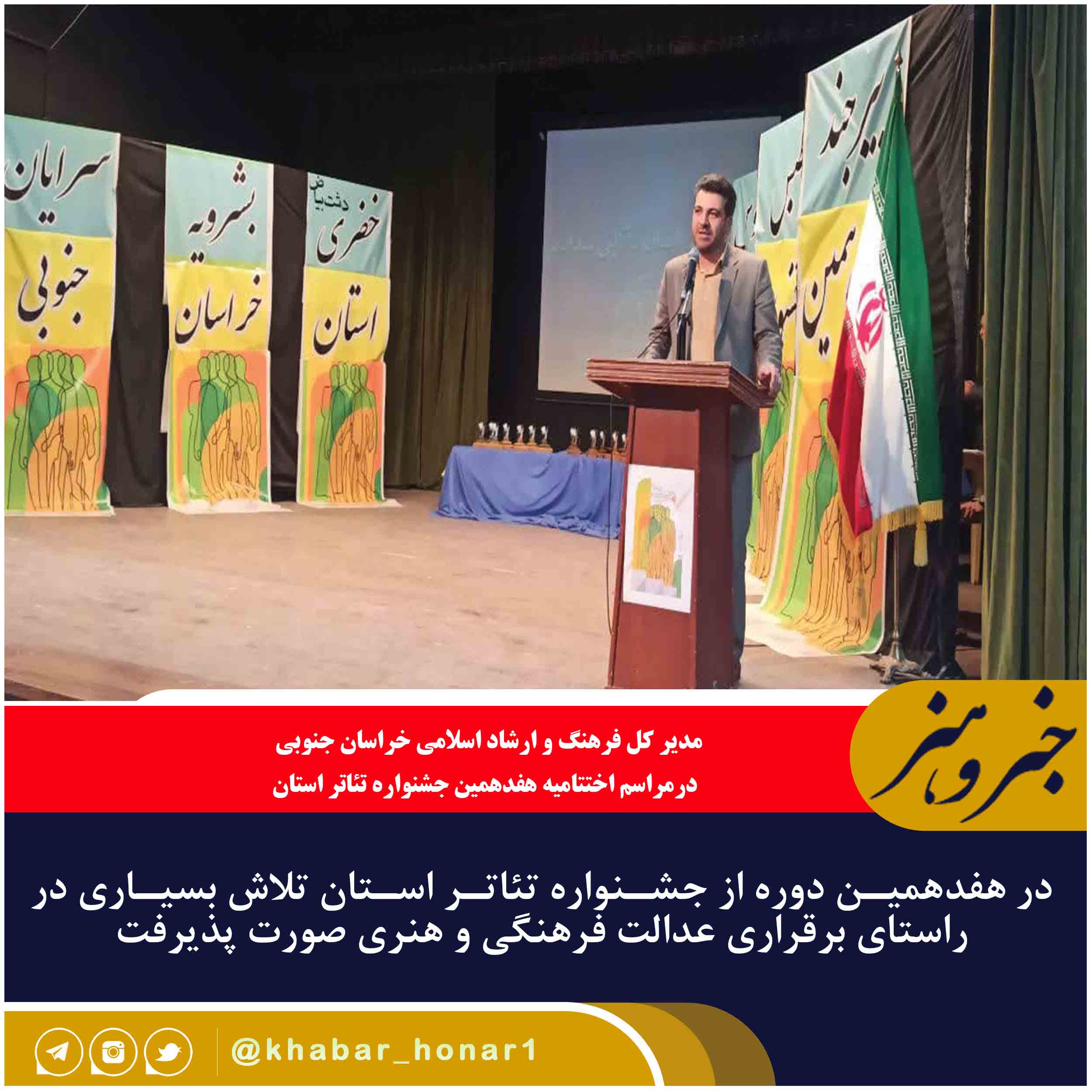 وی در پایان سخنان خود گفت: «در هفدهمین دوره از جشنواره تئاتر استان تلاش بسیاری در راستای برقراری عدالت فرهنگی و هنری در استان به وقوع پیوست که حضور و درخشش شهرهای نسبتا کمتر فعال همچون خضری با وجود داشتن استعدادهای بسیار، نشان از همین امر و توجه به توزیع عادلانه ثروت فرهنگی در استان میباشد.»