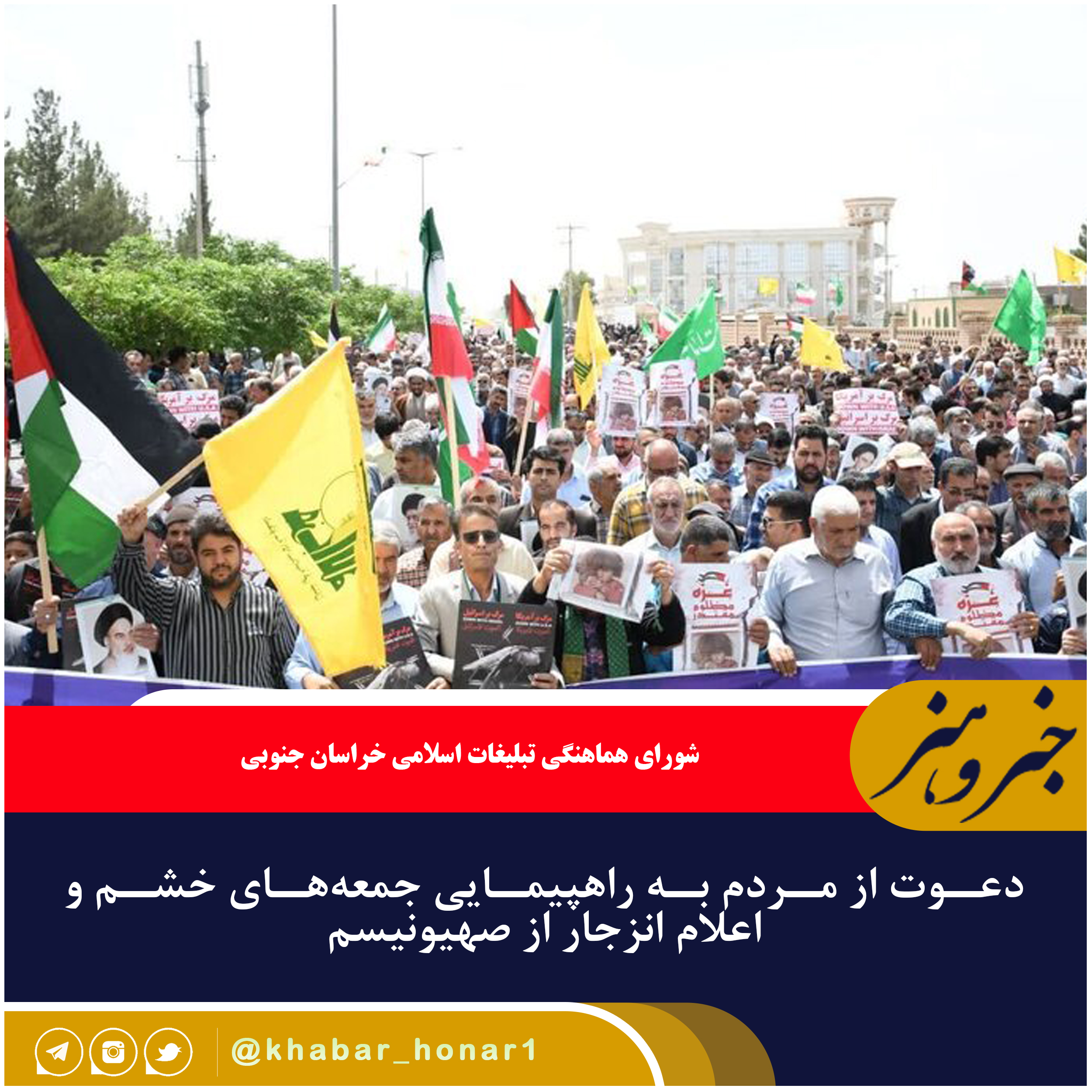 شورای هماهنگی تبلیغات اسلامی خراسان جنوبی از مردم برای شرکت در راهپیمایی جمعههای خشم و اعلام انزجار از صهیونیسم جنایتپیشه و حمایت قاطع از ملت مظلوم غزه دعوت کرد.