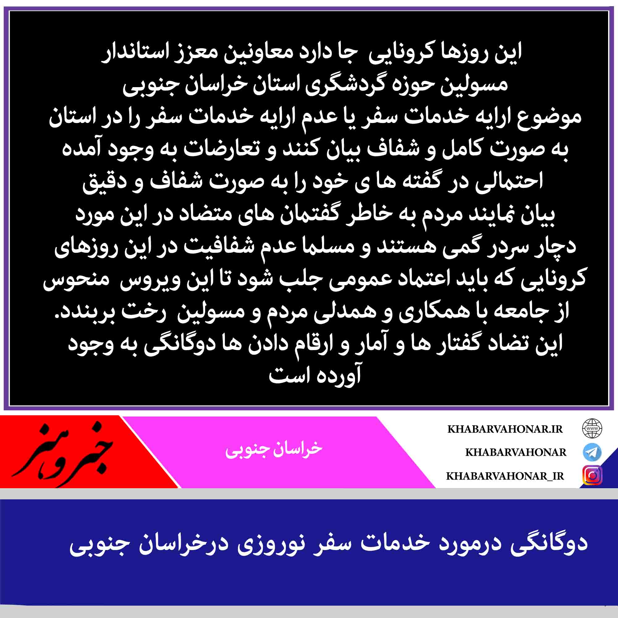 این روزها کرونایی جا دارد معاونین معزز استاندار مسولین حوزه گردشگری استان خراسان جنوبی موضوع ارایه خدمات سفر یا عدم ارایه خدمات سفر را در استان به صورت کامل و شفاف بیان کنند و تعارضات به وجود آمده احتمالی در گفته ها ی خود را به صورت شفاف و دقیق بیان نمایند مردم به خاطر گفتمان های متضاد در این مورد دچار سردر گمی هستند و مسلما عدم شفافیت در این روزهای کرونایی که باید اعتماد عمومی جلب شود تا این ویروس منحوس از جامعه با همکاری و همدلی مردم و مسولین رخت بربندد. این تضاد گفتار ها و آمار و ارقام دادن ها دوگانگی به وجود آورده است