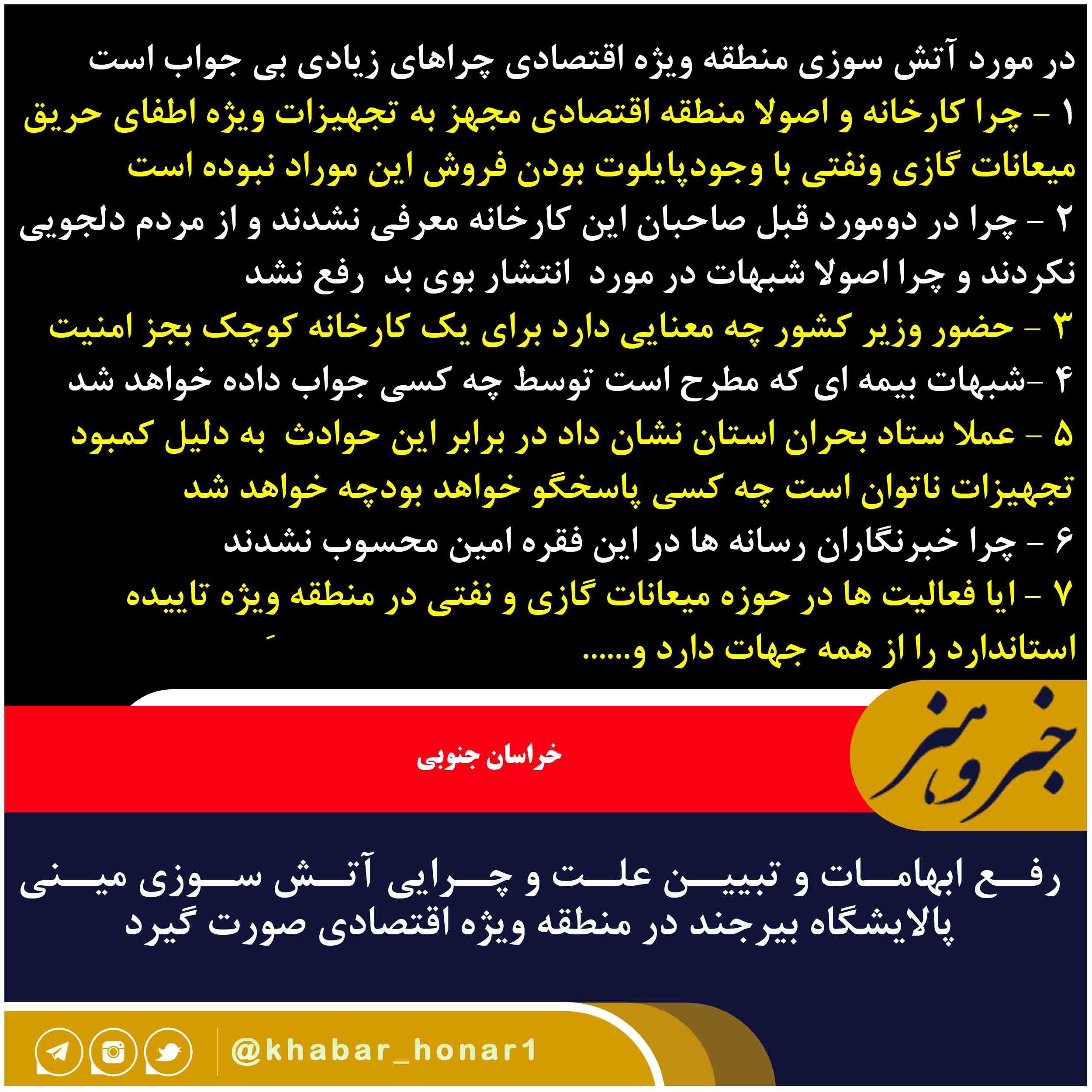 در مورد آتش سوزی منطقه ویژه اقتصادی چراهای زیادی بی جواب است ۱ – چرا کارخانه و اصولا منطقه اقتصادی مجهز به تجهیزات ویژه اطفای حریق میعانات گازی ونفتی با وجودپایلوت بودن فروش این موراد نبوده است ۲ – چرا در دومورد قبل صاحبان این کارخانه معرفی نشدند و از مردم دلجویی نکردند و چرا اصولا شبهات در مورد انتشار بوی بد رفع نشد ۳ – حضور وزیر کشور چه معنایی دارد برای یک کارخانه کوچک بجز امنیت ۴ -شبهات بیمه ای که مطرح است توسط چه کسی جواب داده خواهد شد ۵ – عملا ستاد بحران استان نشان داد در برابر این حوادث به دلیل کمبود تجهیزات ناتوان است چه کسی پاسخگو خواهد بودچه خواهد شد ۶ – چرا خبرنگاران رسانه ها در این فقره امین محسوب نشدند ۷ – ایا فعالیت ها در حوزه میعانات گازی و نفتی در منطقه وِیژه تاییده استاندارد را از همه جهات دارد و…..