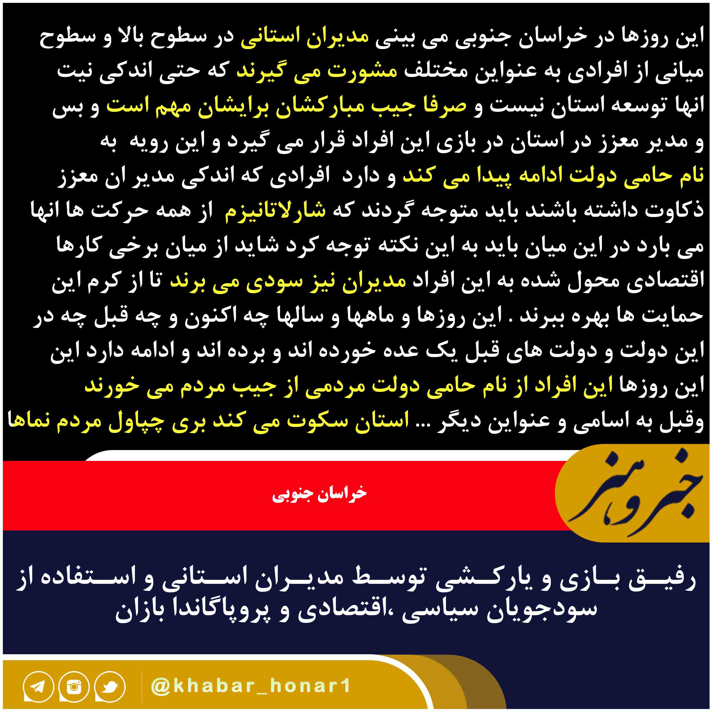 این روزها در خراسان جنوبی می بینی مدیران استانی در سطوح بالا و سطوح میانی از افرادی به عنواین مختلف مشورت می گیرند که حتی اندکی نیت انها توسعه استان نیست و صرفا جیب مبارکشان برایشان مهم است و بس و مدیر معزز در استان در بازی این افراد قرار می گیرد و این رویه به نام حامی دولت ادامه پیدا می کند و دارد افرادی که اندکی مدیر ان معزز ذکاوت داشته باشند باید متوجه گردند که شارلاتانیزم از همه حرکت ها انها می بارد در این میان باید به این نکته توجه کرد شاید از میان برخی کارها اقتصادی محول شده به این افراد مدیران نیز سودی می برند تا از کرم این حمایت ها بهره ببرند . این روزها و ماهها و سالها چه اکنون و چه قبل چه در این دولت و دولت های قبل یک عده خورده اند و برده اند و ادامه دارد این این روزها این افراد از نام حامی دولت مردمی از جیب مردم می خورند وقبل به اسامی و عنواین دیگر … استان سکوت می کند بری چپاول مردم نماها