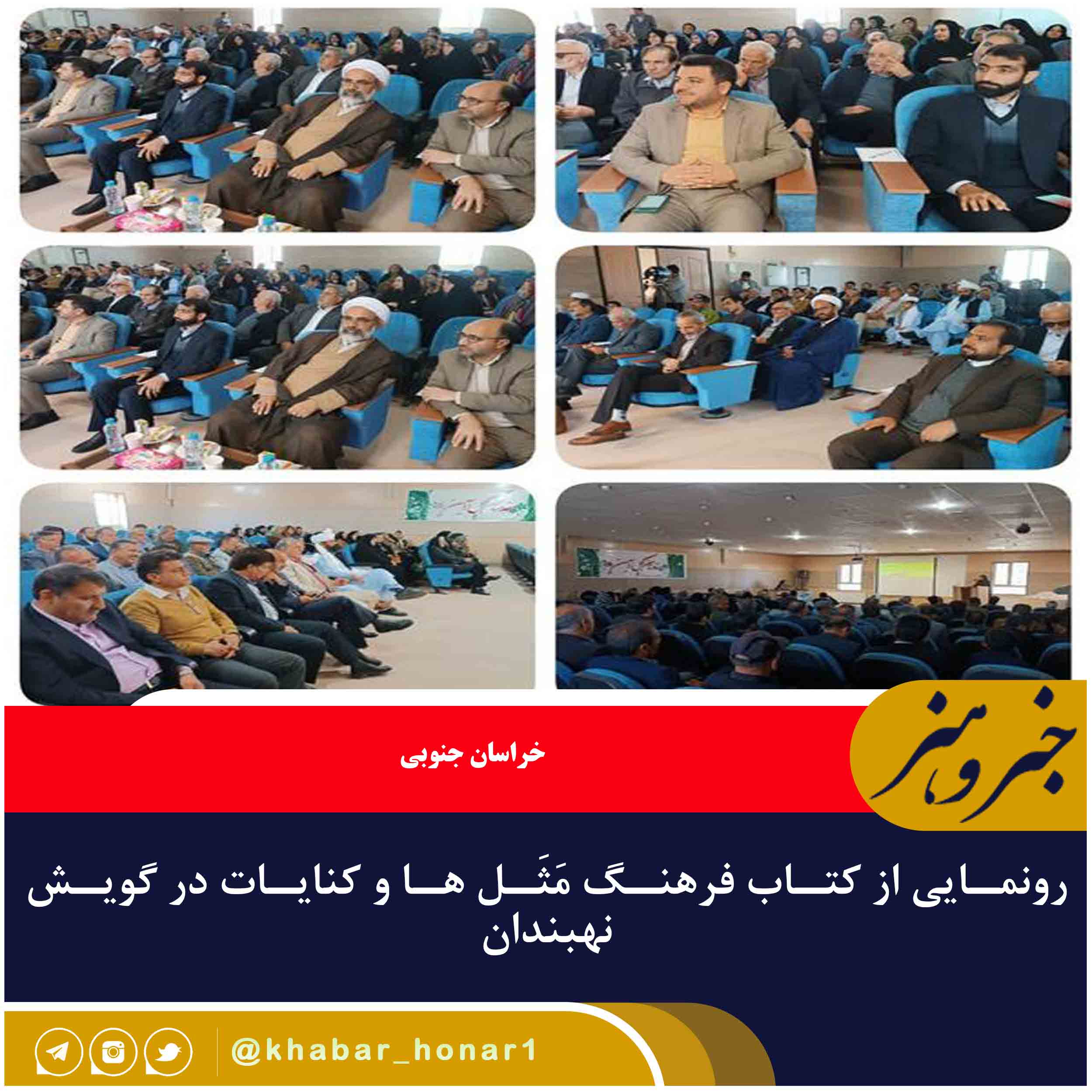 آیین رونمایی از کتاب فرهنگ مَثَل ها و کنایات در گویش نهبندان با حضور مهدی مرادی؛ مدیرکل دفتر استاندار، حسین رضا نخعی مدیرکل دفتر امور فرهنگی و اجتماعی استانداری خراسانجنوبی، علی فرخنده؛ مدیرکل فرهنگ و ارشاد اسلامی استان، جمعی از مسئولین، اصحاب فرهنگ و هنر، مدیران کانون های مساجد و اعضای جبهه انقلاب در شهرستان نهبندان برگزار گردید. در این مراسم که در محل سالن اجتماعات دانشگاه فی و حرفه ای نهبندان برگزار شد، محمودی، عضو هیئت علمی دانشگاه سیستان و بلوچستان، به معرفی کتاب و جایگاه آن در فرهنگ و ادبیات عامه مردم نهبندان پرداخت.