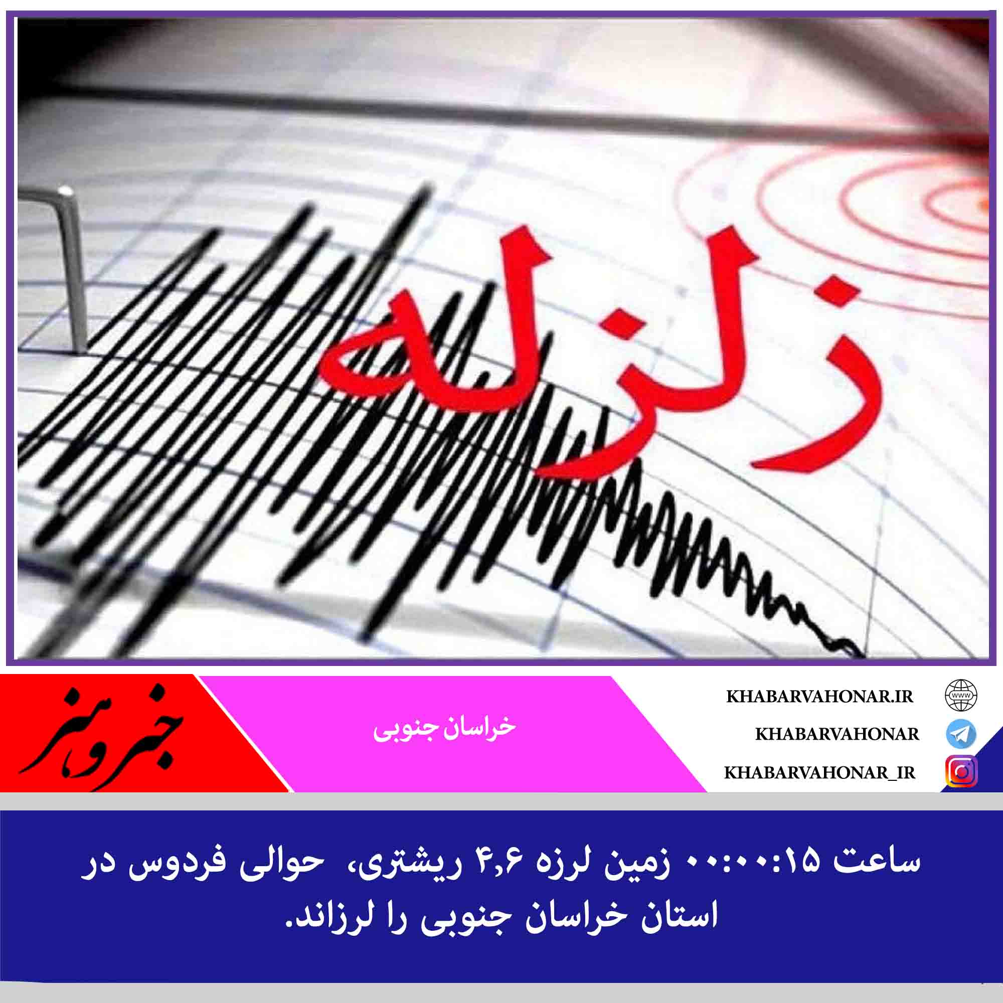 بر اساس ثبت مؤسسه ژئوفیزیک دانشگاه تهران زمین لرزه ۴.۶ ریشتری حوالی فردوس در استان خراسان جنوبی را لرزاند. این زمین لرزه در ساعت ۰۰:۰۰:۱۵ این منطقه را لرزانده است.