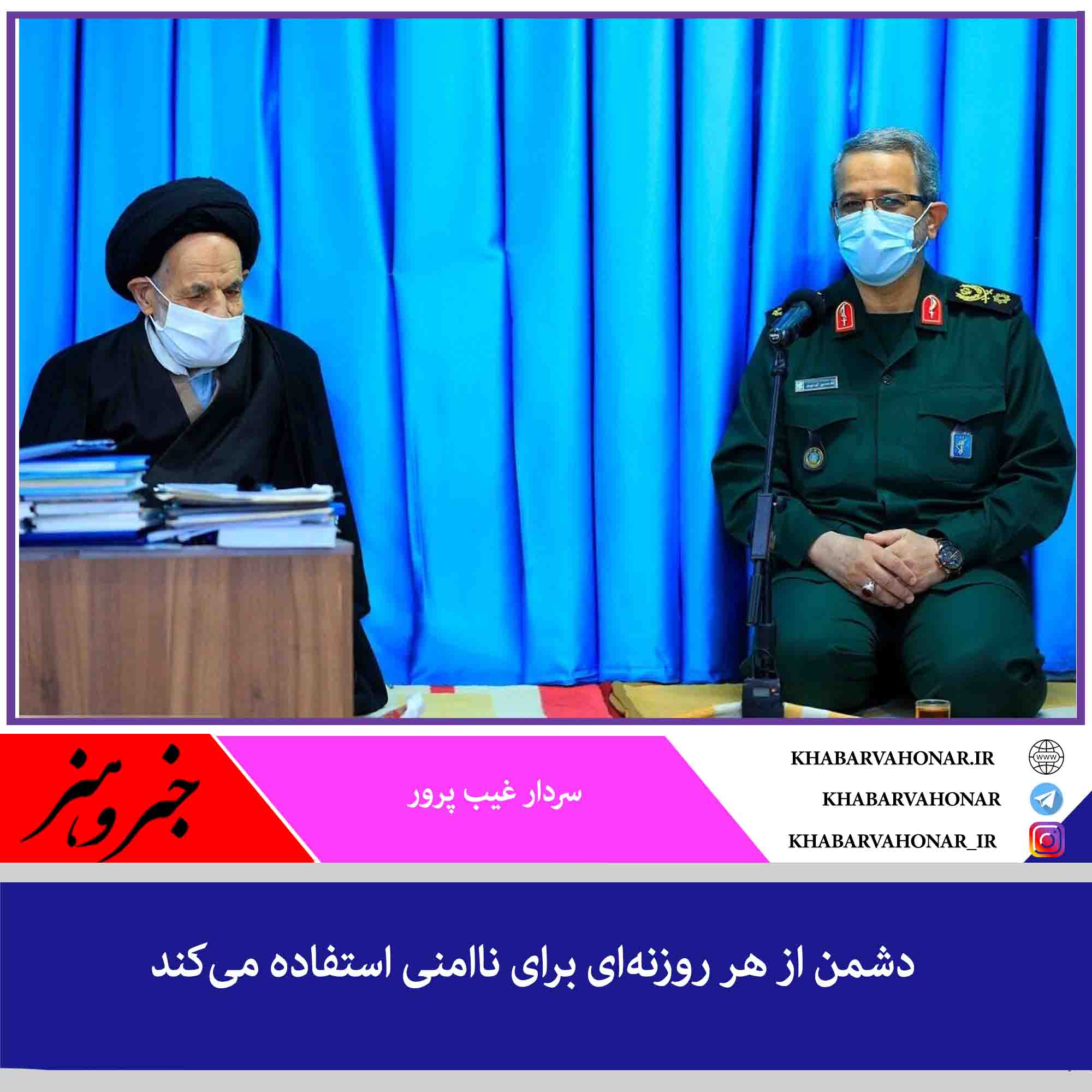 سردار سرتیپ پاسدار غلامحسین غیب پرور روز دوشنبه در دیدار با حجت الاسلام و المسلمین سید علیرضا عبادی نماینده ولی فقیه در خراسان جنوبی افزود: دشمن در این چهل و چند سال با شیطنتهایی که انجام داده است تلاش کرد که به اهداف پلید خود برسد و این چند سال اخیر هم با تحرکات خود سعی دارد برای کشور حوادث امنیتی درست کند.