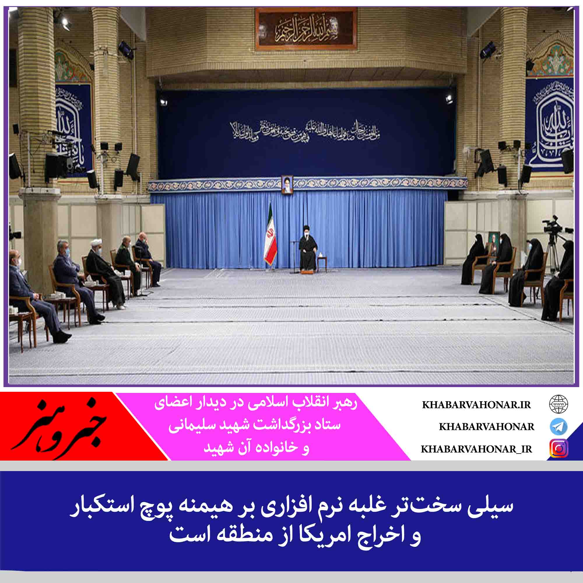 حضرت آیتالله خامنهای رهبر معظم انقلاب اسلامی صبح امروز (چهارشنبه) در دیدار اعضای ستاد بزرگداشت سالگرد سپهبد شهید سردار سلیمانی و خانواده آن شهید والامقام، شهید سلیمانی را قهرمان ملت ایران و قهرمان امت اسلامی خواندند و گفتند: تشییع میلیونی شهید سلیمانی و شهید ابومهدی المهندس در عراق و ایران، اولین سیلی سخت به امریکاییها بود اما سیلی سختتر «غلبه نرم افزاری بر هیمنه پوچ استکبار» و «اخراج امریکا از منطقه» است، البته آمران و قاتلان سردار سلیمانی نیز باید انتقام پس دهند و این انتقام در هر زمانی که ممکن باشد، قطعی است.
