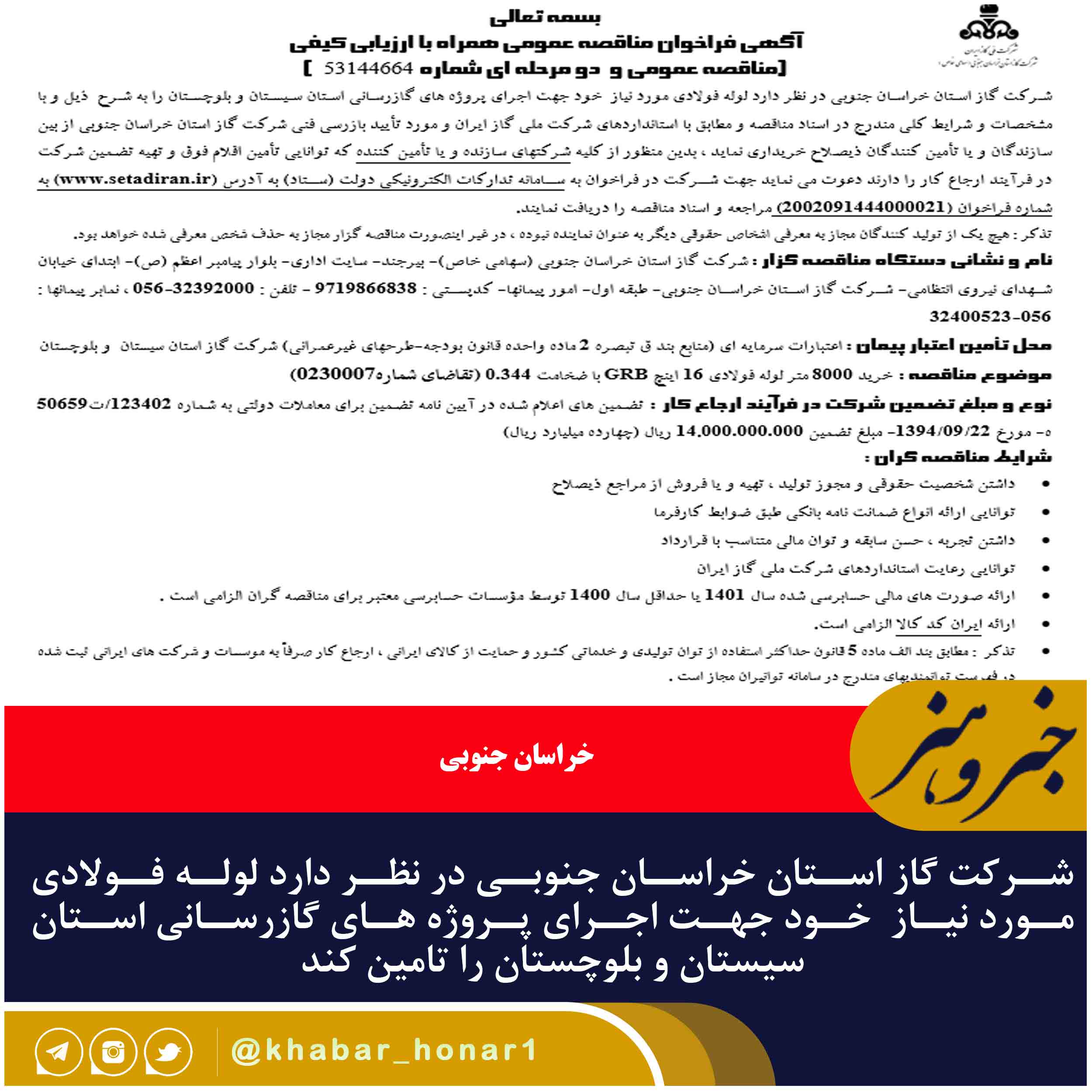 شرکت گاز استان خراسان جنوبی در نظر دارد لوله فولادی مورد نیاز خود جهت اجرای پروژه های گازرسانی استان سیستان و بلوچستان را به شرح ذیل و با مشخصات و شرایط کلی مندرج در اسناد مناقصه و مطابق با استانداردهای شرکت ملی گاز ایران و مورد تأیید بازرسی فنی شرکت گاز استان خراسان جنوبی از بین سازندگان و یا تأمین کنندگان ذیصلاح خریداری نماید ، بدین منظور از کلیه شرکتهای سازنده و یا تأمین کننده که توانایی تأمین اقلام فوق و تهیه تضمین شرکت در فرآیند ارجاع کار را دارند دعوت می نماید جهت شرکت در فراخوان به سامانه تدارکات الکترونیکی دولت (ستاد) به آدرس (www.setadiran.ir) به شماره فراخوان (۲۰۰۲۰۹۱۴۴۴۰۰۰۰۲۱) مراجعه و اسناد مناقصه را دریافت نمایند.