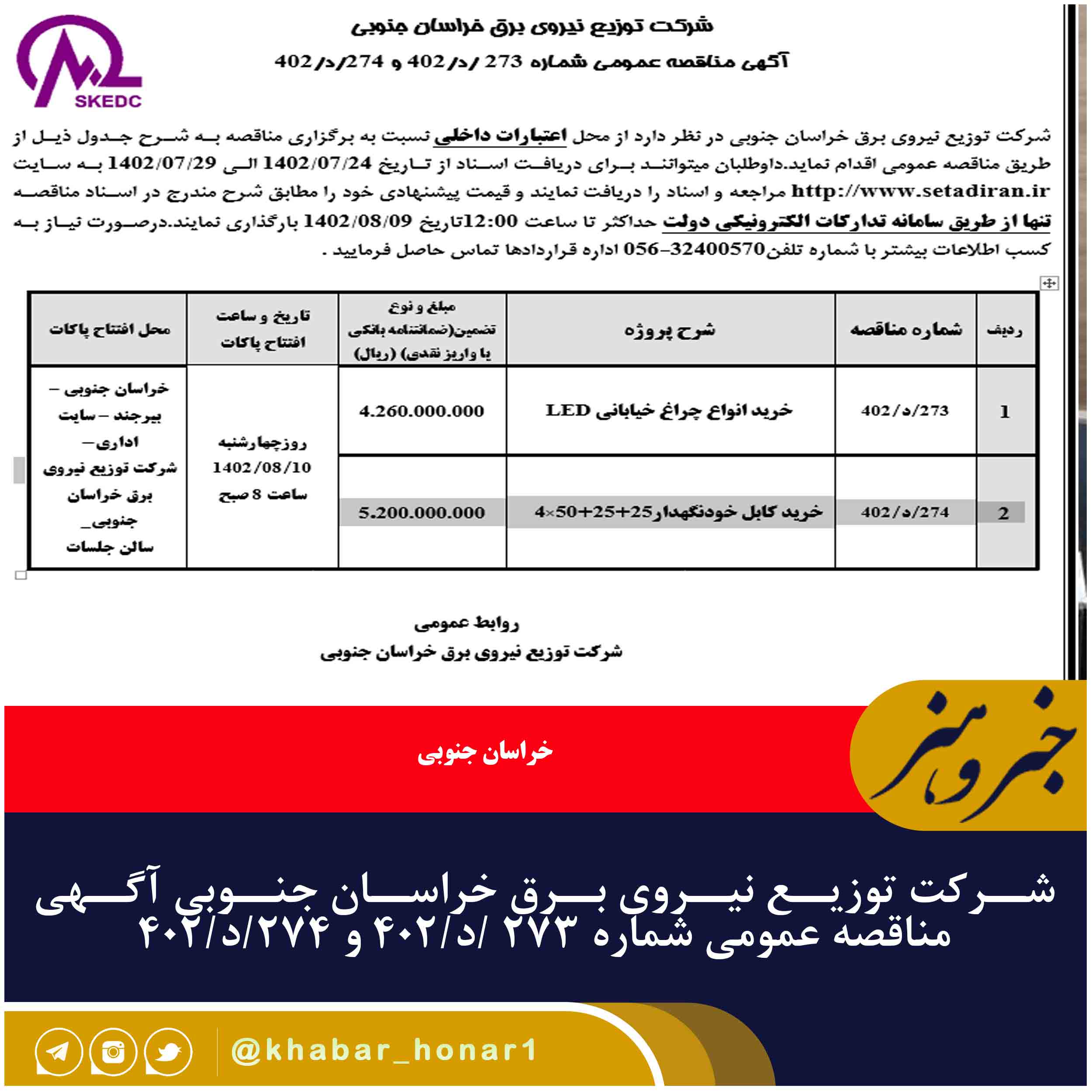 شرکت توزیع نیروی برق خراسان جنوبی در نظر دارد از محل اعتبارات داخلی نسبت به برگزاری مناقصه به شرح جدول ذیل از طریق مناقصه عمومی اقدام نماید.داوطلبان میتوانند برای دریافت اسناد از تاریخ ۲۴/۰۷/۱۴۰۲ الی ۲۹/۰۷/۱۴۰۲ به سایت http://www.setadiran.ir مراجعه و اسناد را دریافت نمایند و قیمت پیشنهادی خود را مطابق شرح مندرج در اسناد مناقصه تنها از طریق سامانه تدارکات الکترونیکی دولت حداکثر تا ساعت ۱۲:۰۰تاریخ ۰۹/۰۸/۱۴۰۲ بارگذاری نمایند.درصورت نیاز به کسب اطلاعات بیشتر با شماره تلفن۳۲۴۰۰۵۷۰-۰۵۶ اداره قراردادها تماس حاصل فرمایید .