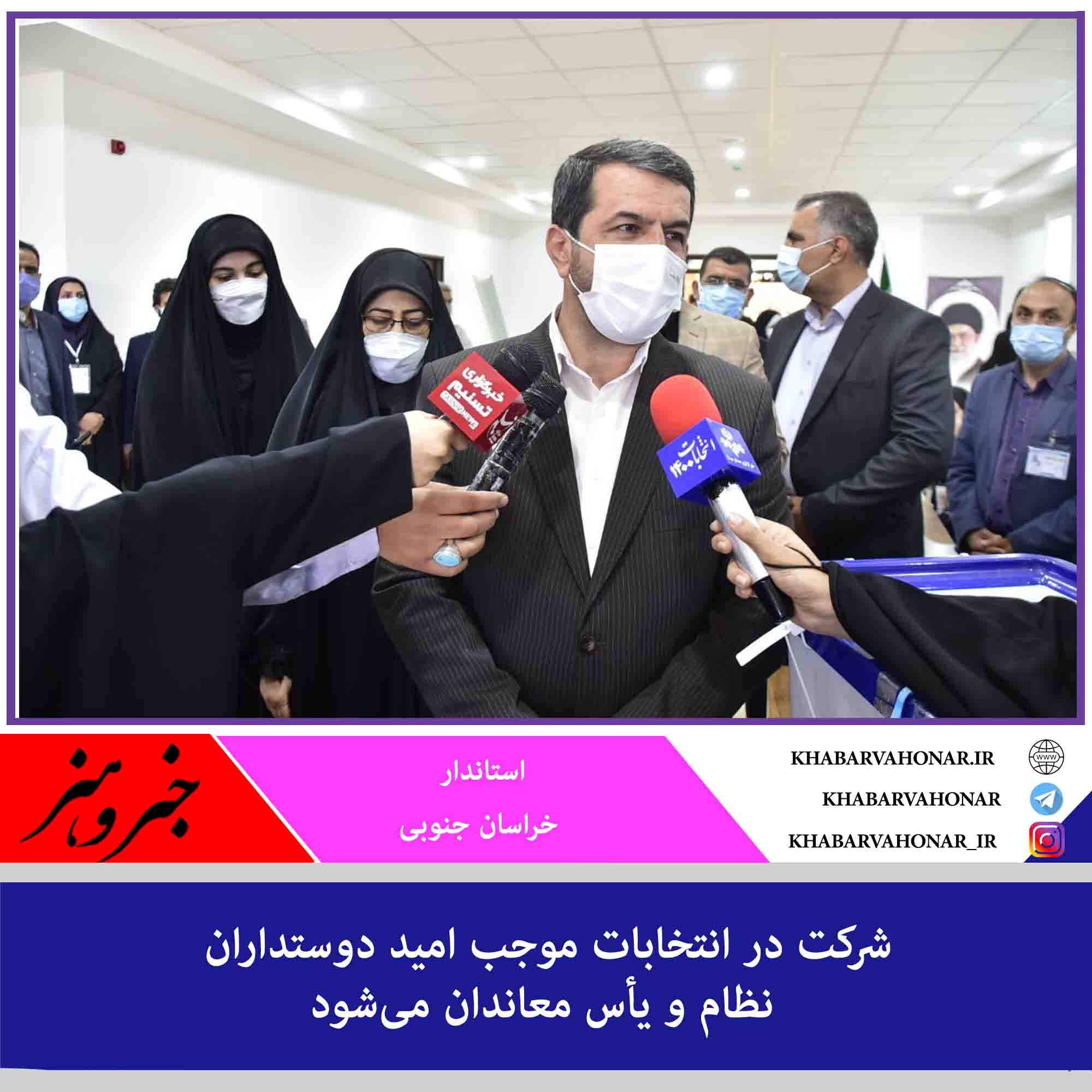 استاندار خراسان جنوبی با بیان اینکه شاهد این هستیم که صف‌های شعب أخذ رأی در حقیقت جشن سیاسی مردم است، گفت: شرکت در انتخابات موجب امید دوستداران نظام و یأس معاندان می‌شود.