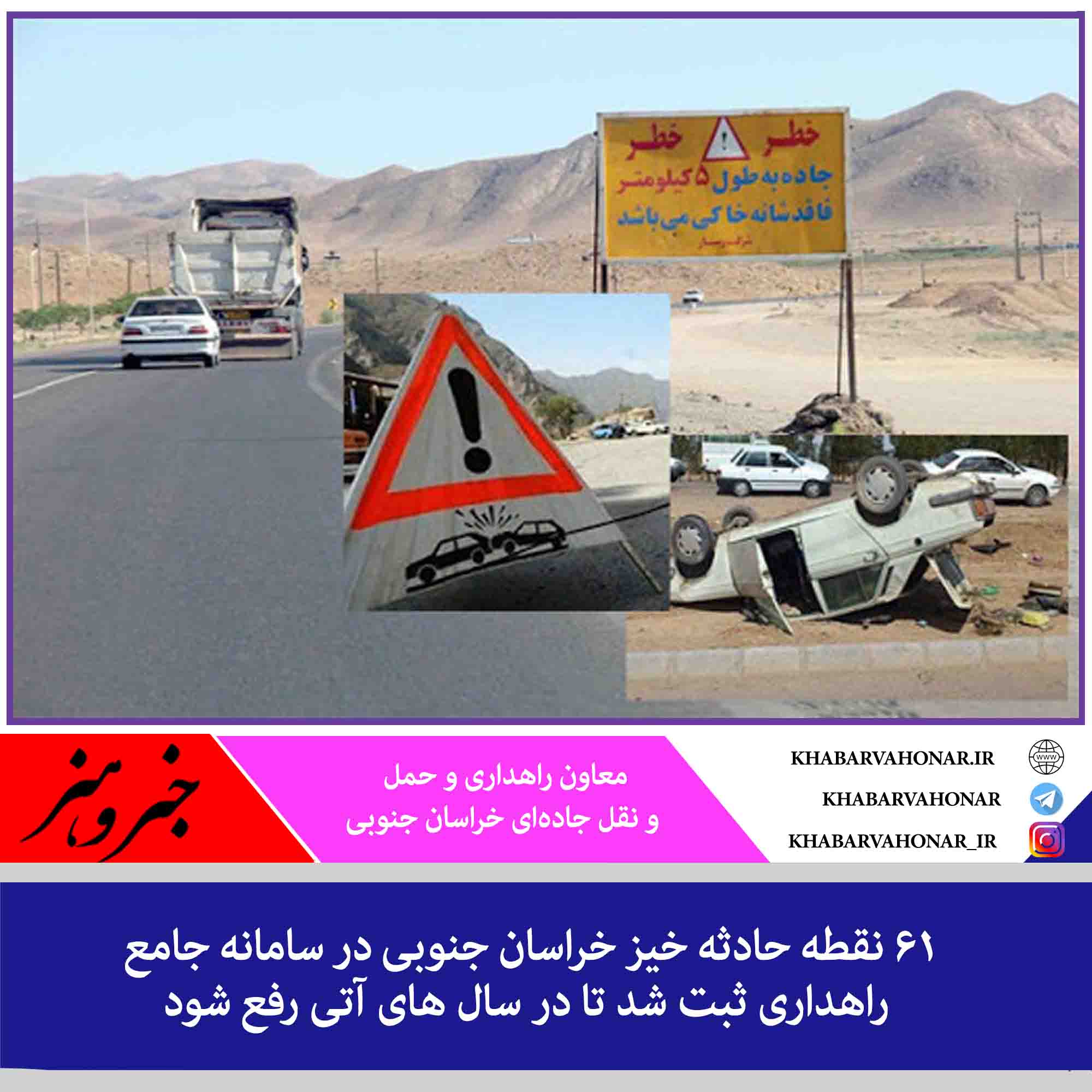 ۶۱ نقطه حادثه خیز خراسان جنوبی در سامانه جامع راهداری ثبت شد تا در سال های آتی رفع شود.