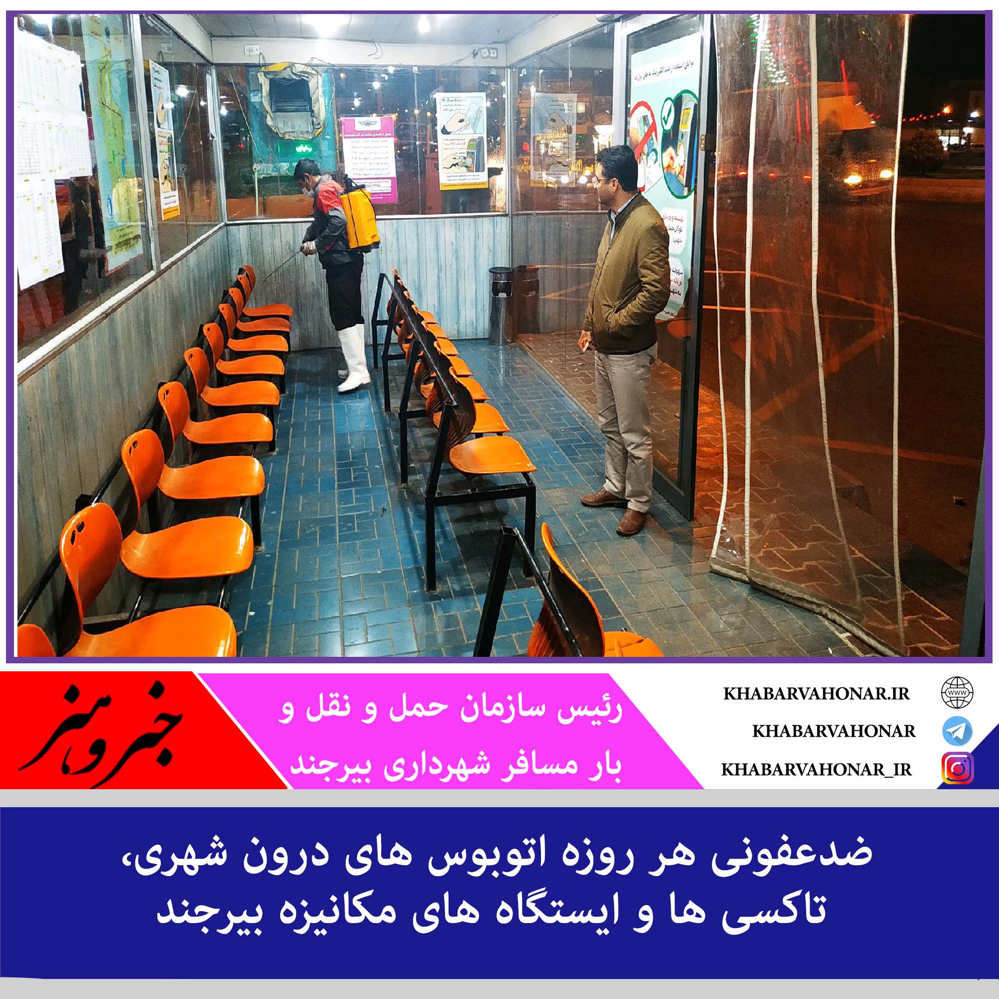 رئیس سازمان حمل و نقل و بار مسافر شهرداری بیرجند از ضدعفونی هر روزه اتوبوس های درون شهری، تاکسی ها و ایستگاه های مکانیزه خبر داد.