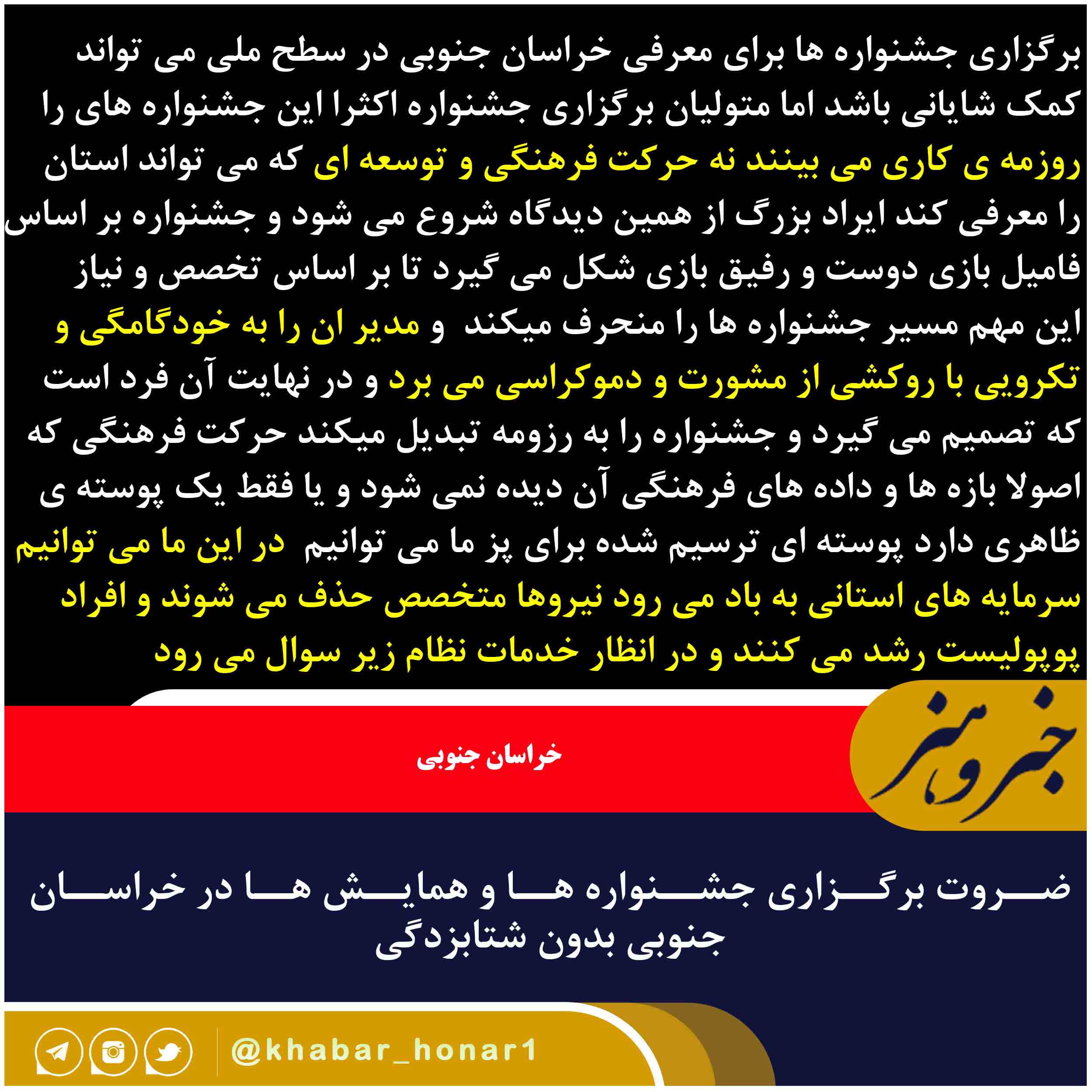 برگزاری جشنواره ها برای معرفی خراسان جنوبی در سطح ملی می تواند کمک شایانی باشد اما متولیان برگزاری جشنواره اکثرا این جشنواره های را روزمه ی کاری می بینند نه حرکت فرهنگی و توسعه ای که می تواند استان را معرفی کند ایراد بزرگ از همین دیدگاه شروع می شود و جشنواره بر اساس فامیل بازی دوست و رفیق بازی شکل می گیرد تا بر اساس تخصص و نیاز این مهم مسیر جشنواره ها را منحرف میکند و مدیر ان را به خودگامگی و تکرویی با روکشی از مشورت و دموکراسی می برد و در نهایت آن فرد است که تصمیم می گیرد و جشنواره را به رزومه تبدیل میکند حرکت فرهنگی که اصولا بازه ها و داده های فرهنگی آن دیده نمی شود و یا فقط یک پوسته ی ظاهری دارد پوسته ای ترسیم شده برای پز ما می توانیم در این ما می توانیم سرمایه های استانی به باد می رود نیروها متخصص حذف می شوند و افراد پوپولیست رشد می کنند و در انظار خدمات نظام زیر سوال می رود