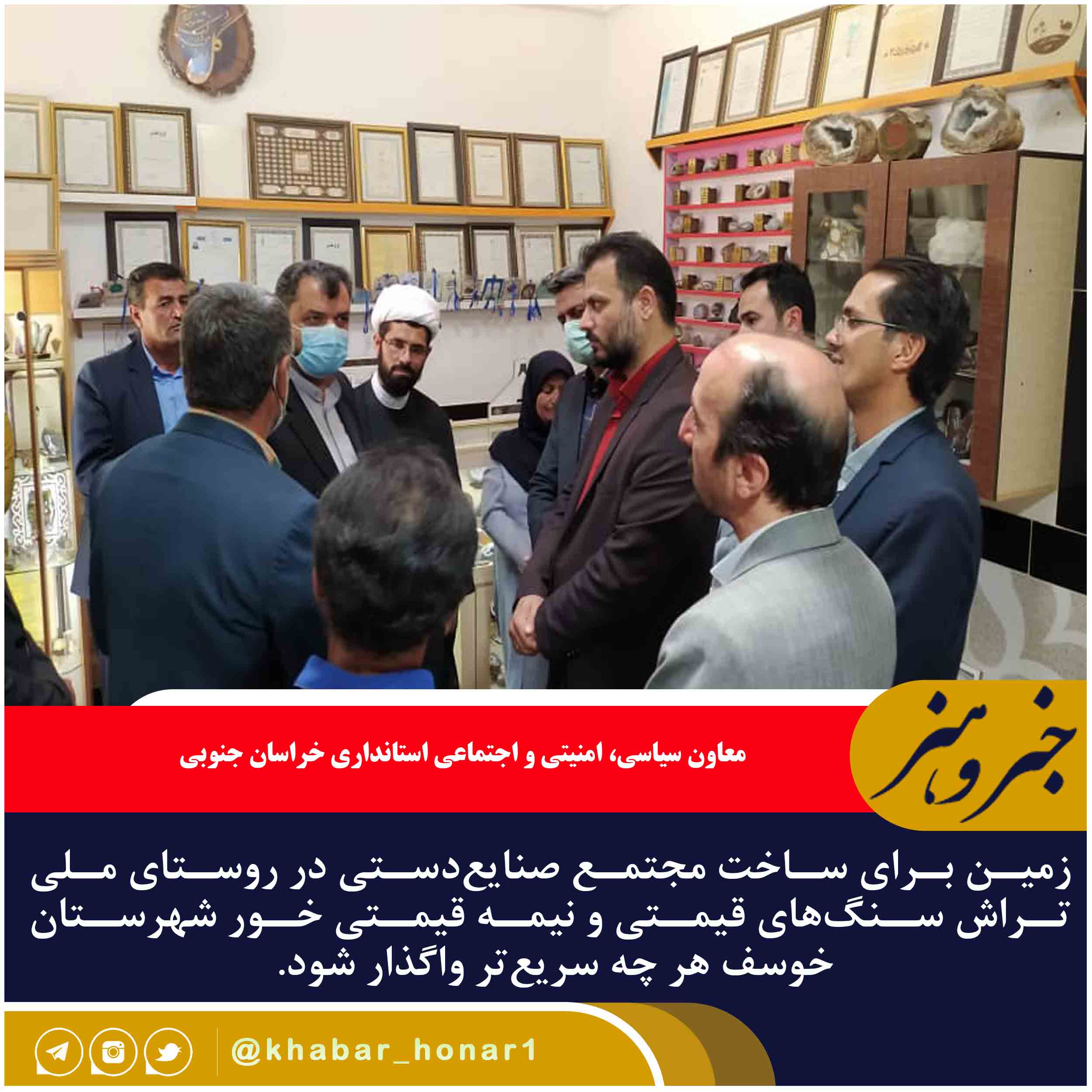معاون سیاسی، امنیتی و اجتماعی استانداری خراسان جنوبی گفت: «زمین برای ساخت مجتمع صنایع‌دستی در روستای ملی تراش سنگ‌های قیمتی و نیمه قیمتی خور شهرستان خوسف هر چه سریع‌تر واگذار شود.»