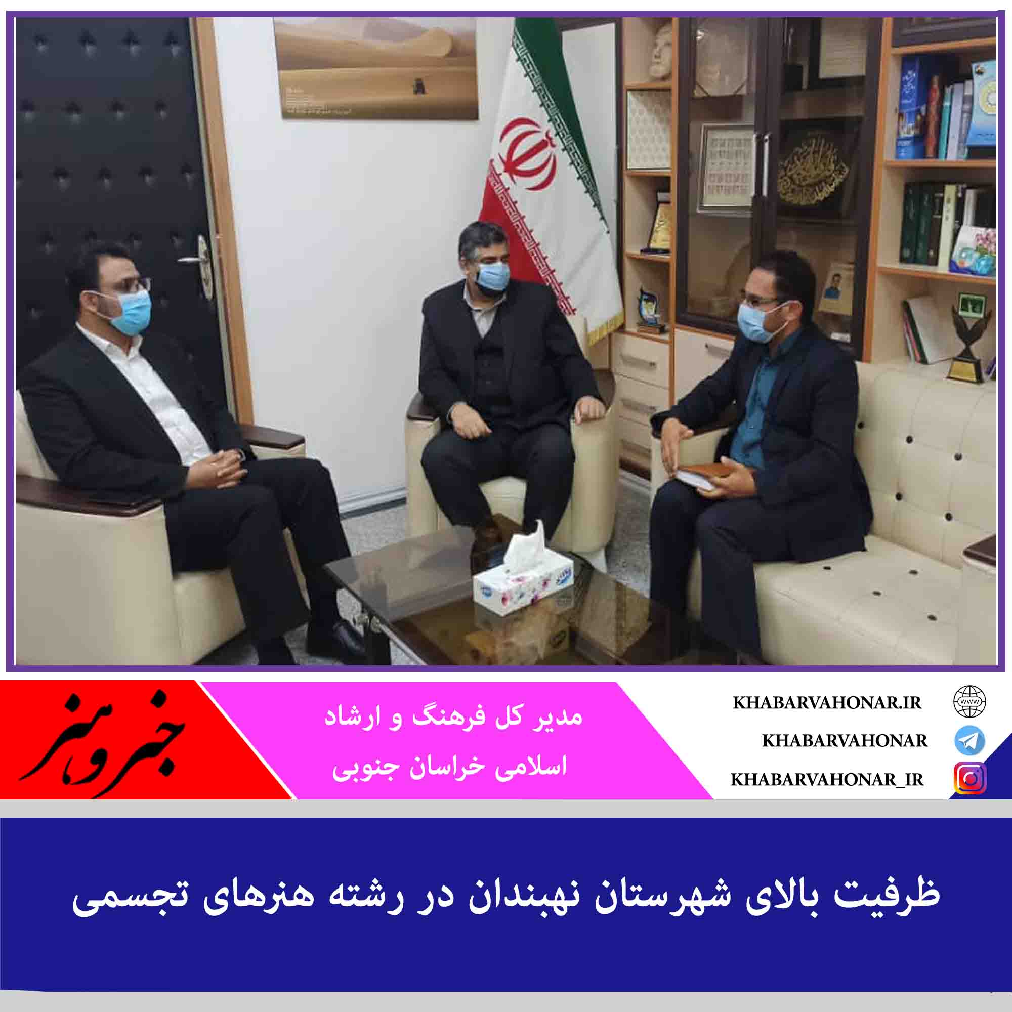 مدیر کل فرهنگ و ارشاد اسلامی خراسان جنوبی از برگزیده شدن شهرستان نهبندان در رشته هنرهای تجسمی نخستین دوره شبکه شهرهای خلاق فرهنگی و هنری کشور نیز خبر داد و یادآورشد: قرار گرفتن نام این شهرستان در کنار شهرهای بزرگی همچون اصفهان و یزد، نشان دهنده ظرفیت بسیار بالای نهبندان است.به گزارش روابط عمومی اداره کل فرهنگ و ارشاد اسلامی خراسان جنوبی، صبح سه شنبه ۷ اردیبهشت ماه، ناصر نبی زاده در سفر به شهرستان نهبندان، با فرماندار این شهرستان دیدار و گفتگو کرد.