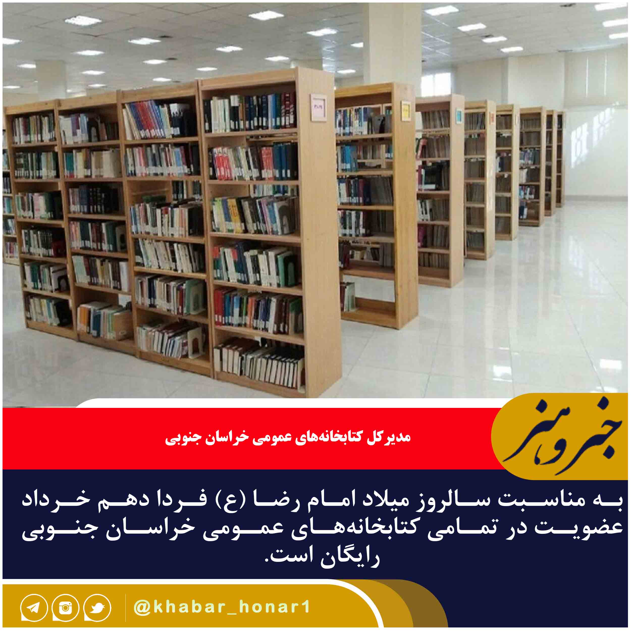 مدیرکل کتابخانههای عمومی خراسان جنوبی گفت: به مناسبت سالروز میلاد امام رضا (ع) فردا دهم خرداد عضویت در تمامی کتابخانههای عمومی خراسان جنوبی رایگان است.