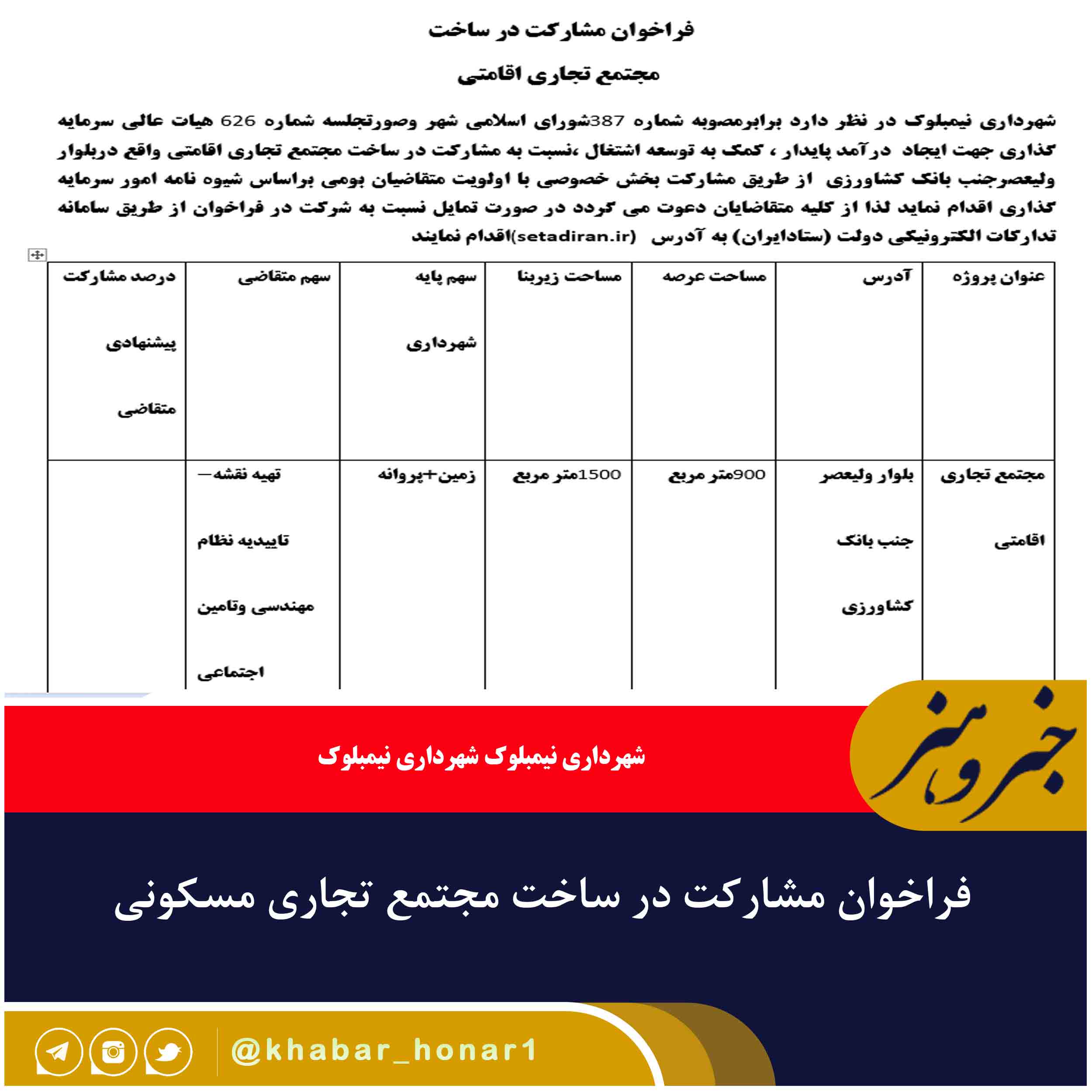 شهرداری نیمبلوک در نظر دارد برابرمصوبه شماره ۳۸۷شورای اسلامی شهر وصورتجلسه شماره ۶۲۶ هیات عالی سرمایه گذاری جهت ایجاد درآمد پایدار ، کمک به توسعه اشتغال ،نسبت به مشارکت در ساخت مجتمع تجاری اقامتی واقع دربلوار ولیعصرجنب بانک کشاورزی از طریق مشارکت بخش خصوصی با اولویت متقاضیان بومی براساس شیوه نامه امور سرمایه گذاری اقدام نماید لذا از کلیه متقاضایان دعوت می گردد در صورت تمایل نسبت به شرکت در فراخوان از طریق سامانه تدارکات الکترونیکی دولت (ستادایران) به آدرس (setadiran.ir)اقدام نمایند