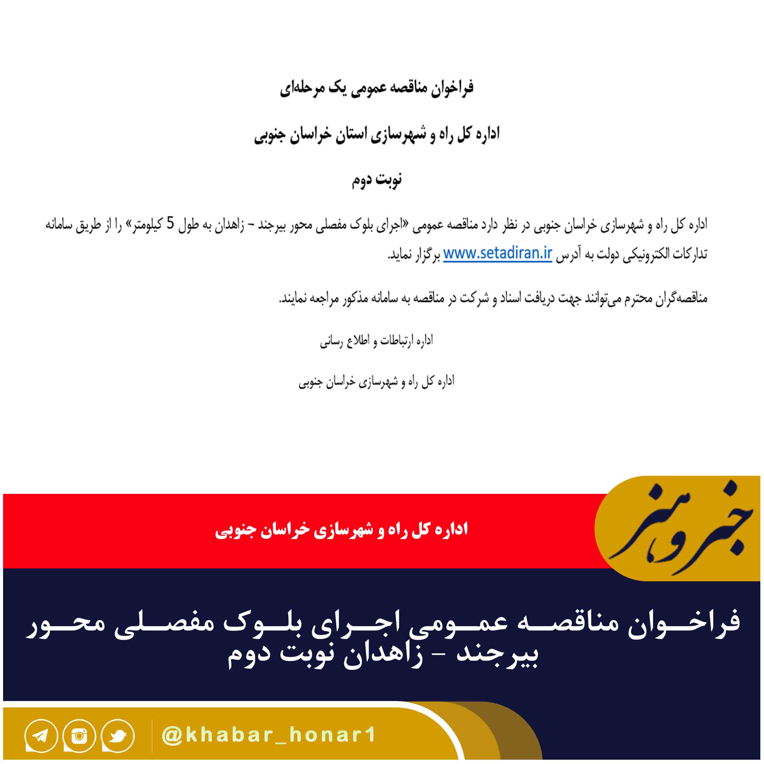 اداره کل راه و شهرسازی خراسان جنوبی در نظر دارد مناقصه عمومی «اجرای بلوک مفصلی محور بیرجند – زاهدان به طول ۵ کیلومتر» را از طریق سامانه تدارکات الکترونیکی دولت به آدرس www.setadiran.ir برگزار نماید.